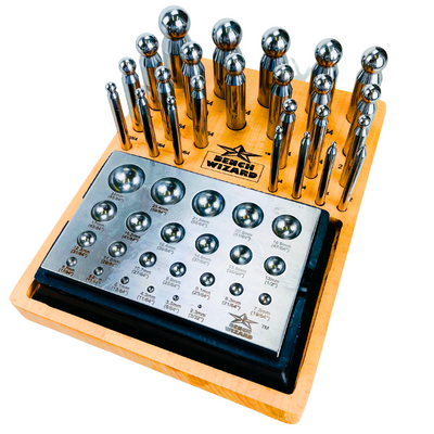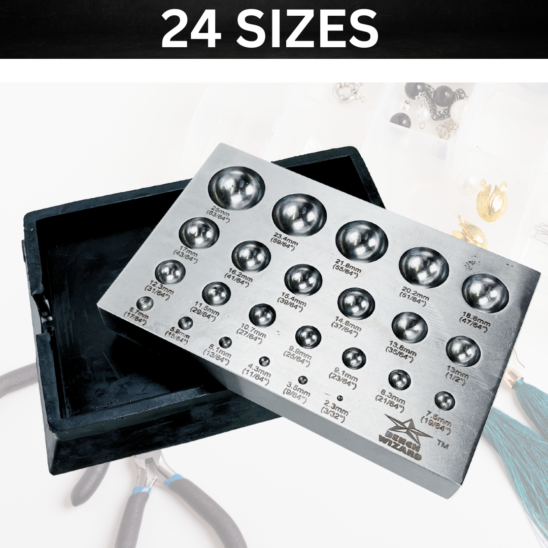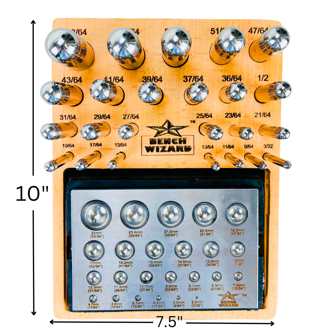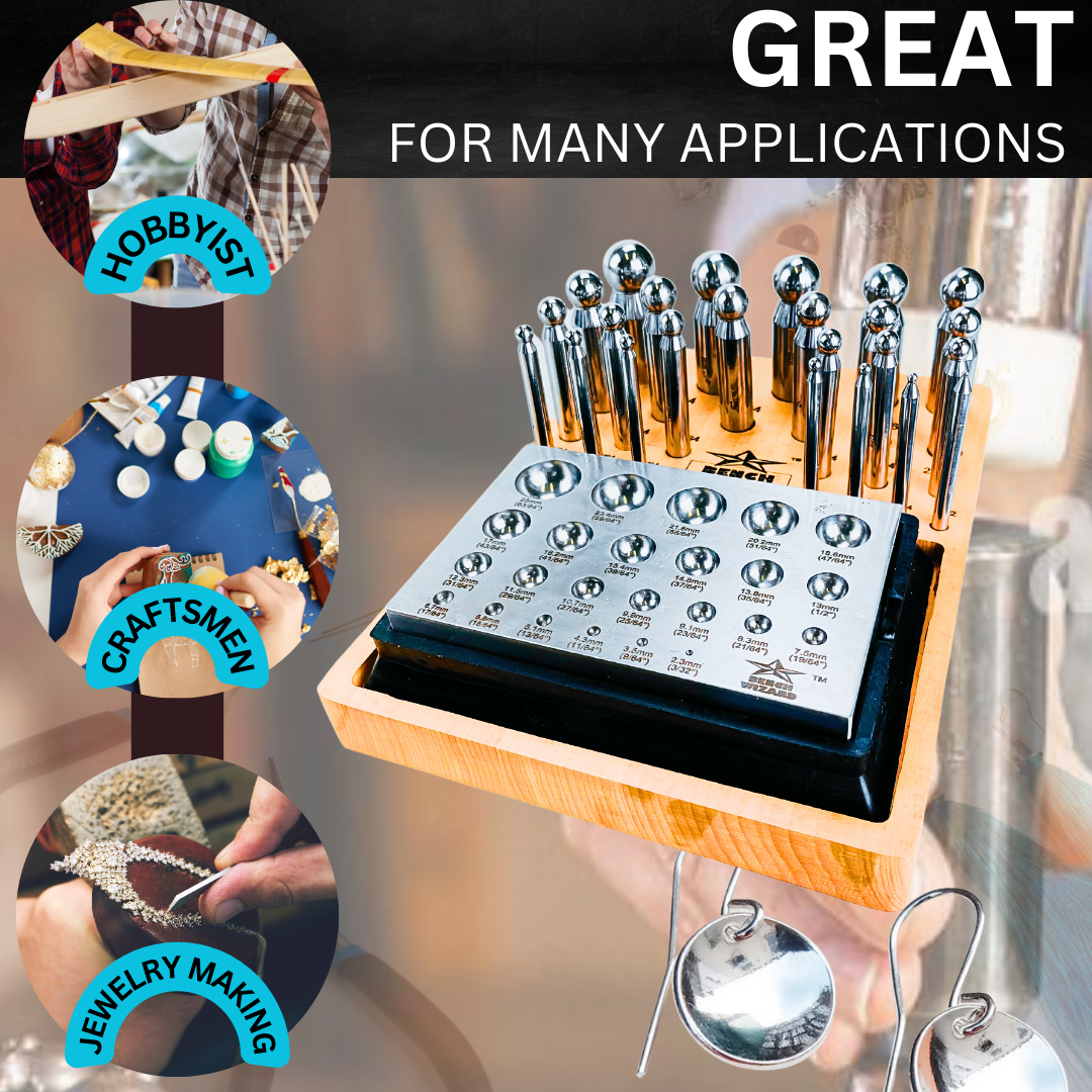 - PREMIUM PUNCHES INCLUDED: Our set comes complete with a selection of high-quality punches that perfectly complement the dapping plate. These precision tools allow you to achieve consistent and clean results every time || Punches are from 3/32" (2.3mm) to 63/64" (25mm)
