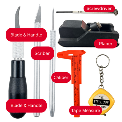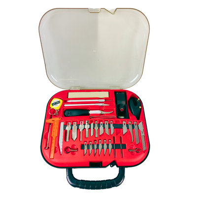 ✅ 38-Piece Complete Set – Includes 18 precision blades, 3 knife handles, 4 gouges, 3 scribers, 2 planers, caliper, mini screwdriver, 1m steel tape, sanding block & more.
