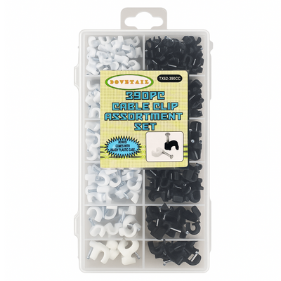 Keep your cables neat, secure, and out of the way with this 390 Piece Cable Clip Assortment Set. Designed for both home and professional use, this set includes black and white plastic clips with durable steel nails to fasten wires safely to walls, ceilings, and baseboards. With 6 popular sizes from 4mm to 12mm, you’ll always have the right clip for electrical wires, coaxial cables, Ethernet lines, and speaker wires. The included plastic storage case keeps everything neatly organized, making this set a must-have for electricians, DIYers, and home improvement projects.