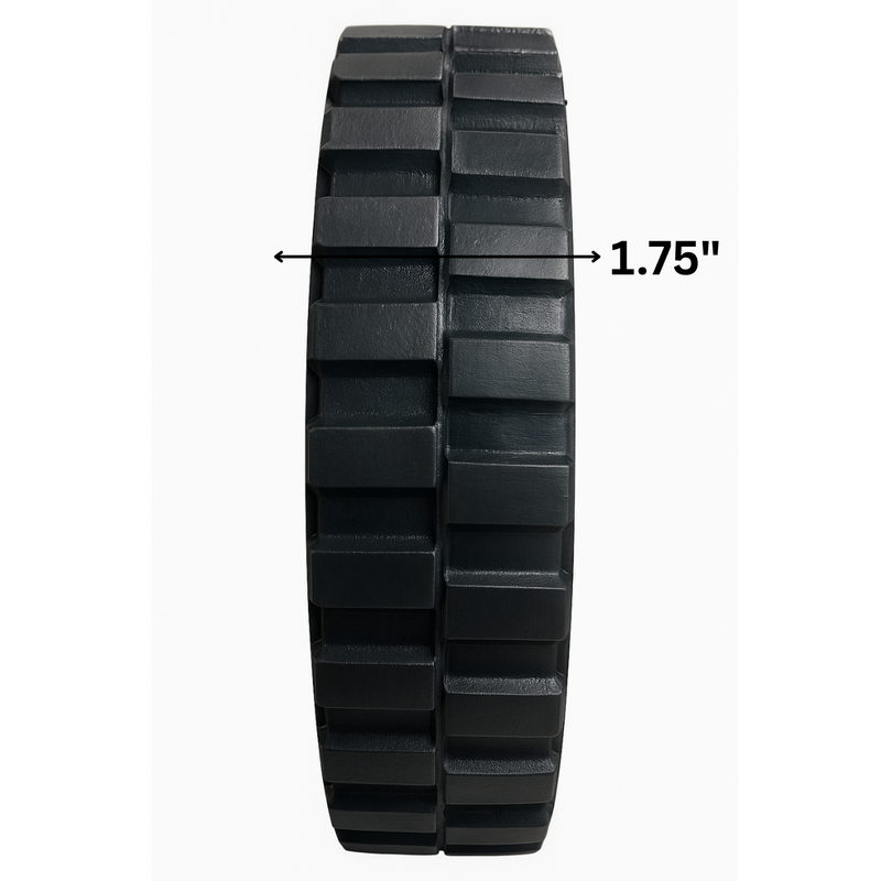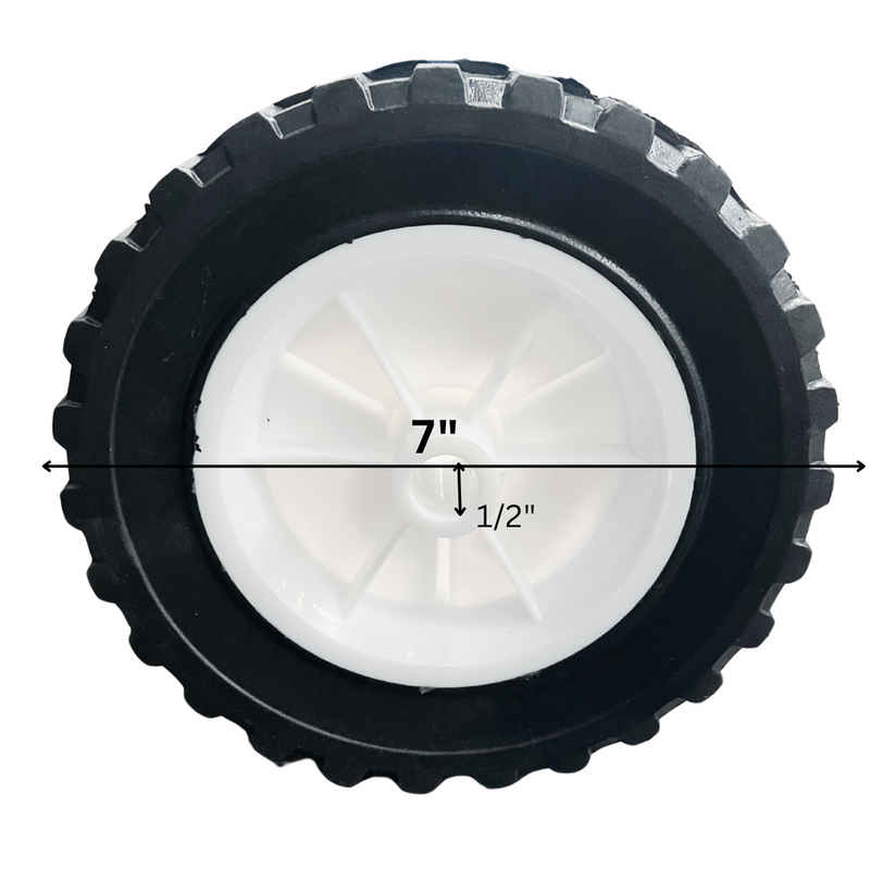 Built for smooth rolling and rugged outdoor use, this 7" Solid Rubber Tire with a durable plastic hub is perfect for a variety of lawn, garden, and light-duty utility equipment. Featuring a treaded rubber surface for enhanced grip and a maintenance-free solid core, this flat-free tire keeps your equipment moving with ease across grass, gravel, and rough terrain. With a 7" diameter, 1.5" width, and 1/2" bore, it's ideal for lawn carts, garden wagons, hose reels, and small yard trailers. Simple to install and resistant to punctures, this replacement tire provides reliable performance season after season.