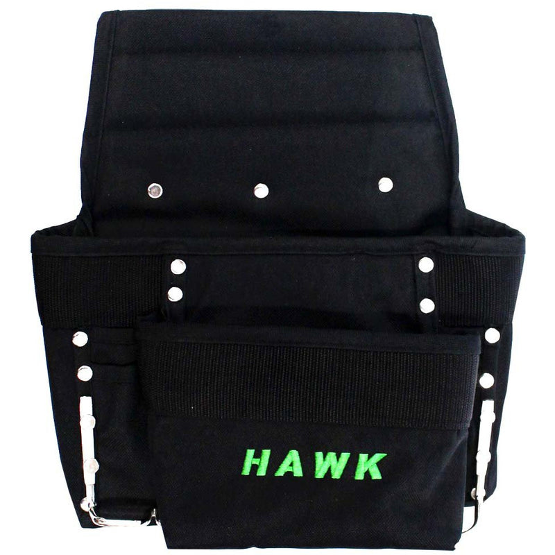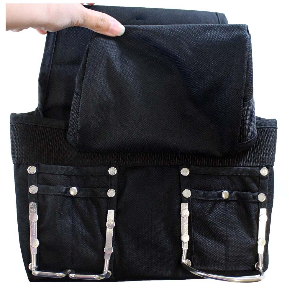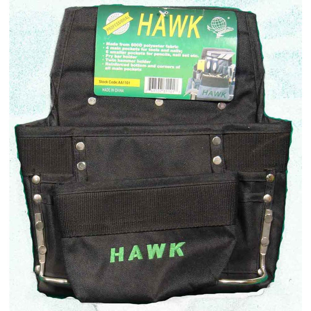 This reliable tool belt is made of strong nylon fabric, and has enough pockets to carry all the tools you need to do the job. Reinforced with rivets at all stress points, this bag will give you dependable use over and over again. Made to be worn on any belt. Includes 2 hammer hangers, and an outside pocket for your nails.This pouch has a belt opening large enough for most any belt-3 3/4 inches * Pouch Measures 12 Inches Long And 11 Inches Across-made To Fit Comfortably * This Pouch Is Reinforced Throughout With Metal Rivets-durability You Can Depend On This bag features 2 metal tool holders, one with a split design to hold plier handles * Great For A Roofer, Builder, Or Demolition Worker, 2 Big Pockets And 6 Small