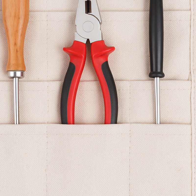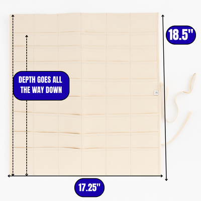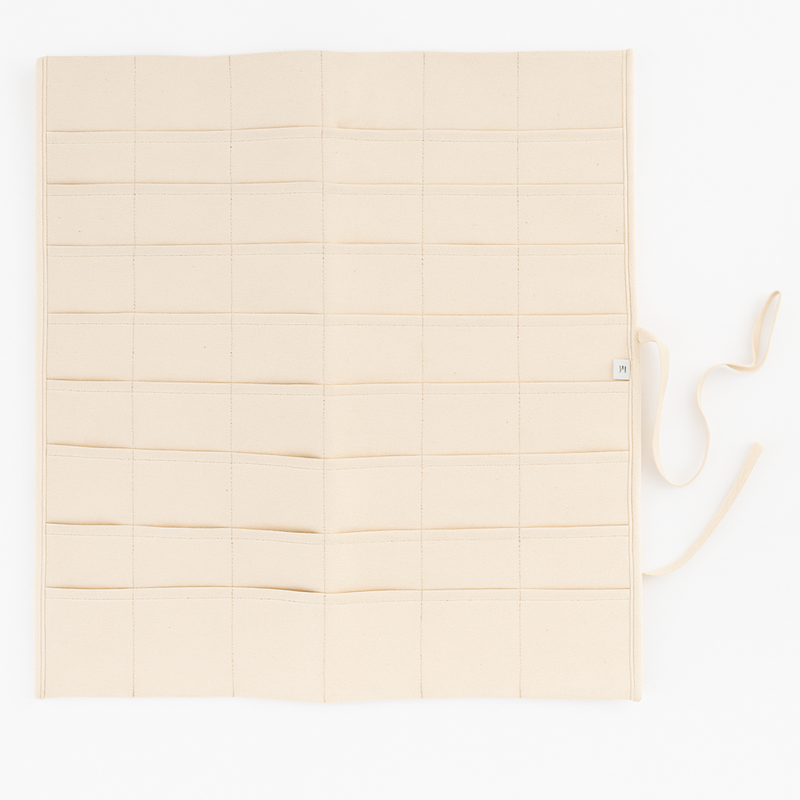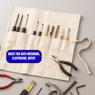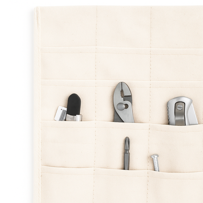 Made of durable 10 oz 100% cotton canvas in a natural color, it’s designed for both professionals and hobbyists who value quality and organization. Each pocket layer is stitched securely, allowing longer tools to fit through to the bottom. Simply lay it flat for easy access on your tabletop or roll it up and tie it closed for compact storage.