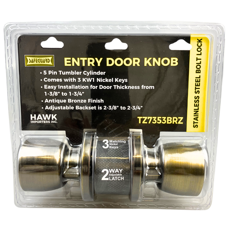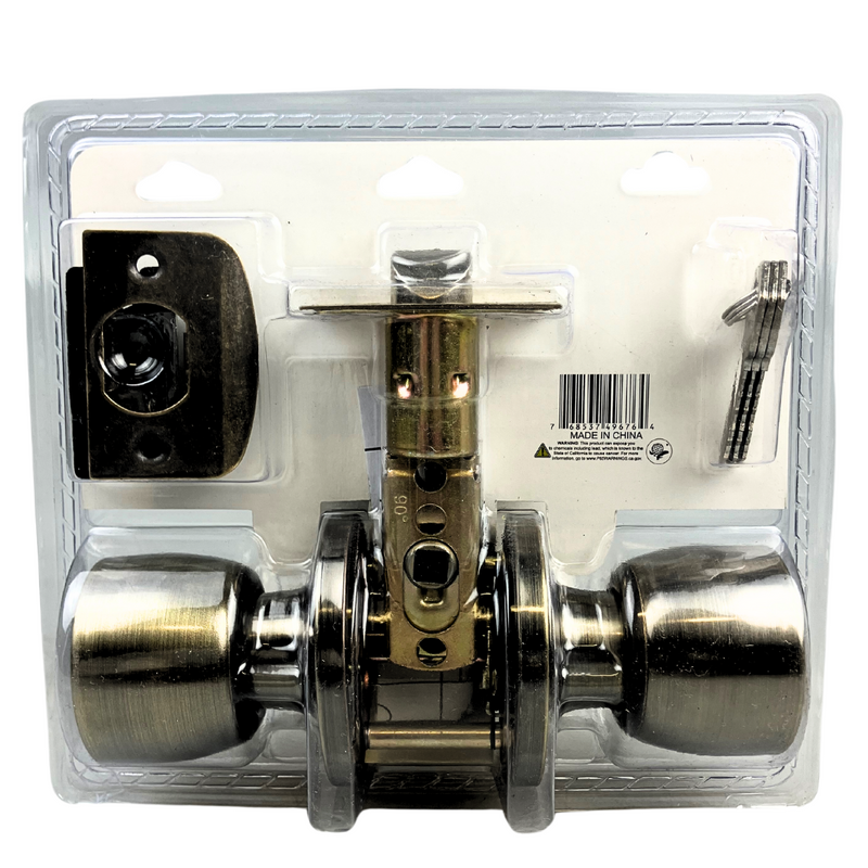 Upgrade your home's security and style with our Antique Bronze Entry Door Knob. This high-quality door knob features a robust five-pin tumbler cylinder for enhanced security and comes with 3KW1 nickel keys. Designed for easy installation on door thicknesses ranging from 1-3/8 inches to 1-3/4 inches, this entry door knob combines durability with an elegant antique copper finish. The adjustable bracket ensures a perfect fit for backsets between 2-3/8 inches and 2-3/4 inches, making it a versatile choice for any entryway.