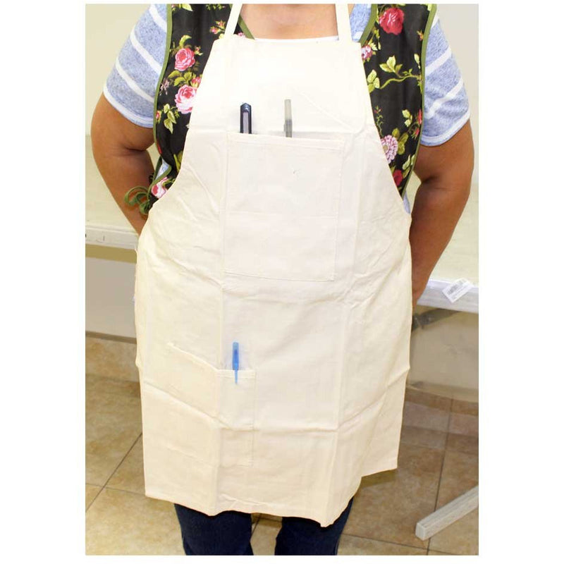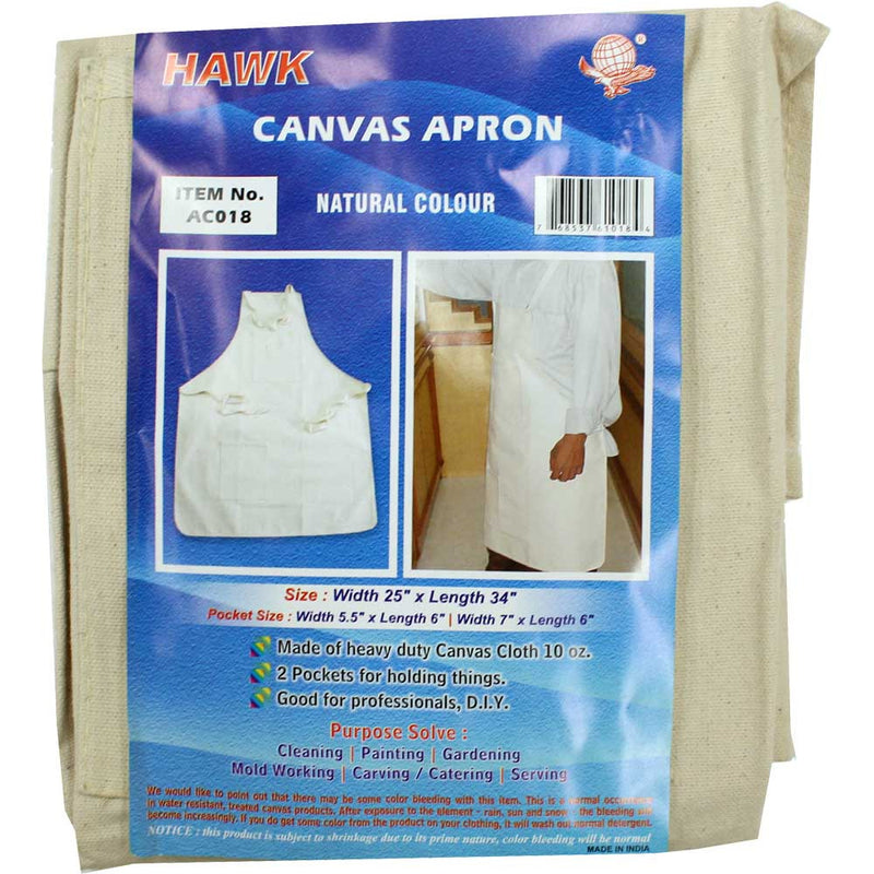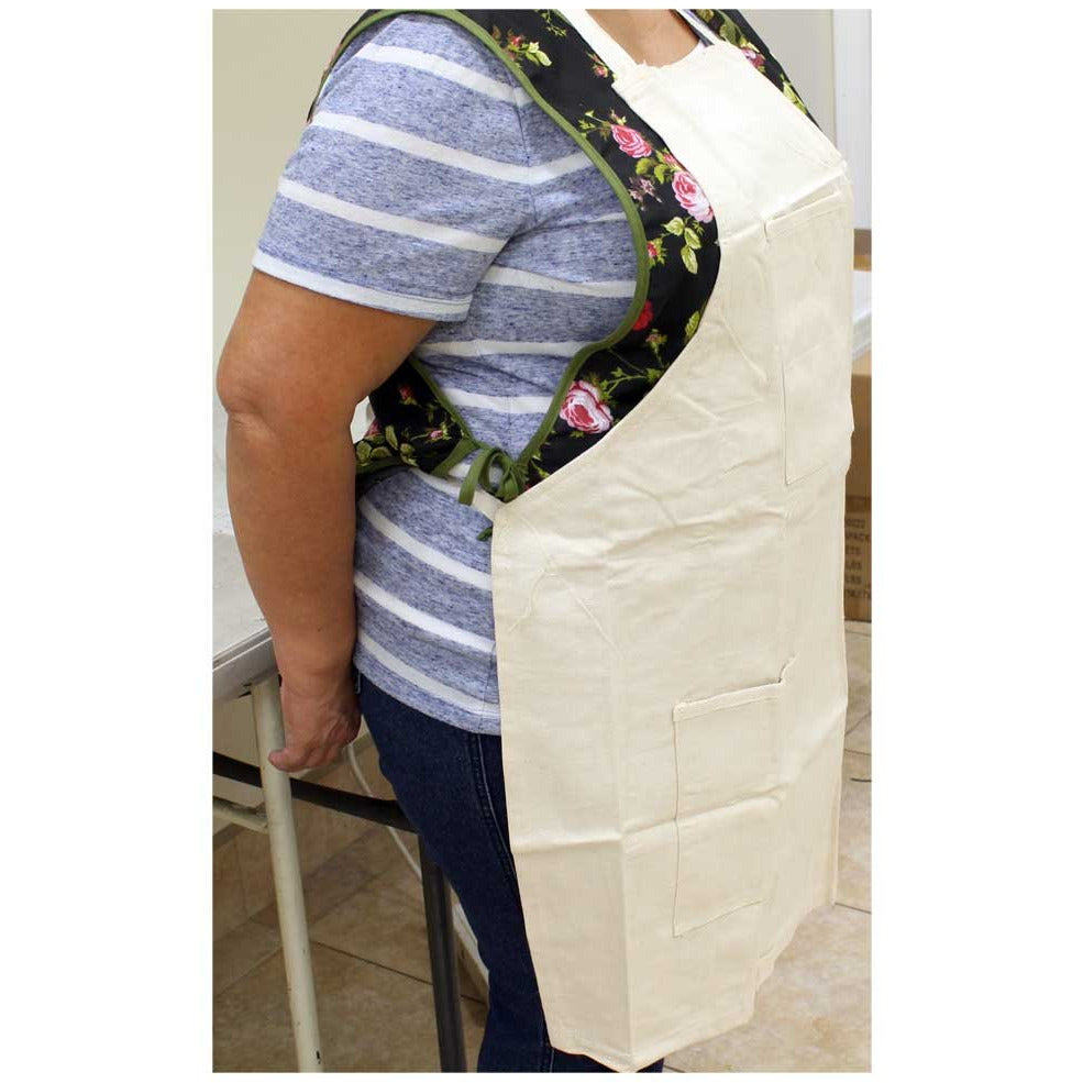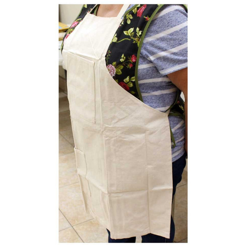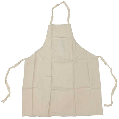 * Bib style front with two pockets (5" x 6" AND 7" x 6"), one at the bib area and one at the bottom* 34 Inch length x 25 inch width with long straps - will fit waist size up to 55 inches* Great for cooking, serving, barbeque, gardening, painting, and other messy jobs* Natural color canvas, sturdy and durable to protect your clothing from messy jobs* Made of strong and durable canvas, machine wash and dry