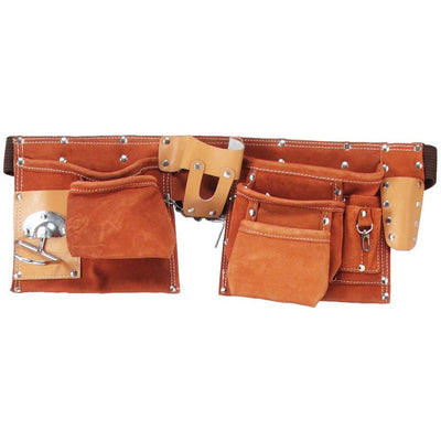 Made Of The Best Suede Leather, This Double Stitched And Rivet Reinforced Tool Bag Is Tough And Ready To Go To Work For You. Two Large Main Pockets, Two Medium And Six Small Pockets, 2 Metal Hammer Holders And 1 Leather Tape Holder, It All Straps Right On For Hands-free Use. 22" Wide X 9" High. Belt Fits Up To 45".* 45" Belt Built-in * Metal Tool Hangers * Rivets At All Stress Points