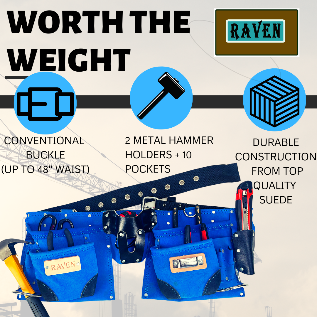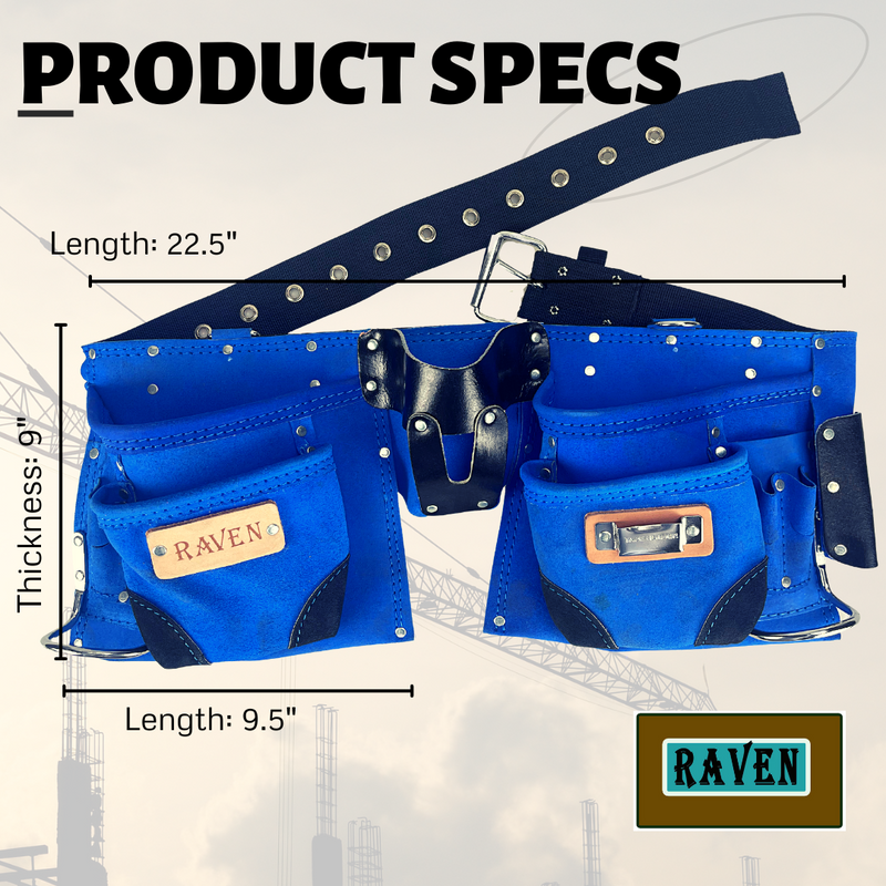 ADDITIONAL STORAGE: A total of 9 additional pockets are located throughout the tool belt | includes swinging hammer loop holder, knife/cutter sheath and tape measure holder