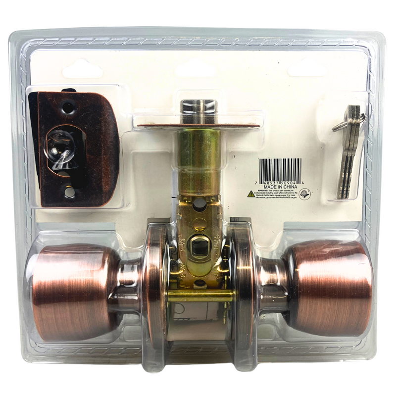 Upgrade your home's security and style with our Antique Copper Entry Door Knob. This high-quality door knob features a robust five-pin tumbler cylinder for enhanced security and comes with 3KW1 nickel keys. Designed for easy installation on door thicknesses ranging from 1-3/8 inches to 1-3/4 inches, this entry door knob combines durability with an elegant antique copper finish. The adjustable bracket ensures a perfect fit for backsets between 2-3/8 inches and 2-3/4 inches, making it a versatile choice for any entryway.