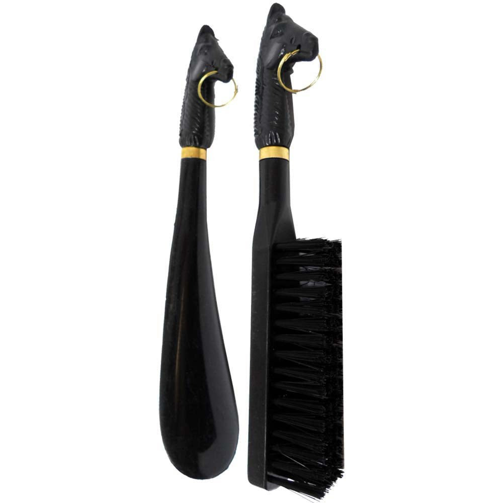 It's almost like having your own personal valet. This set includes a lint brush for your shoes, jacket and slacks, and a shoe horn to help you easily slide your feet into your shoes. Each piece has a nostalgic horses head design on the handle, with a ring to hang easily from a hook. Great for home or travel.* This Set Makes A Great Little Gift For That Man On The Go- The Brush And The Shoe Horn Are Handy * The Brush Can Be Used To Clean The Lint From Your Jacket Or Slacks * The Shoe Horn Can Really Help You Slide Into Your Shoes Without Flattening The Heels * The Classic Horse's Head Design Is Attrative And Stylish For Any Décor * The Two Items Are Made Of Sturdy Plastic And Make A Well Designed Pair