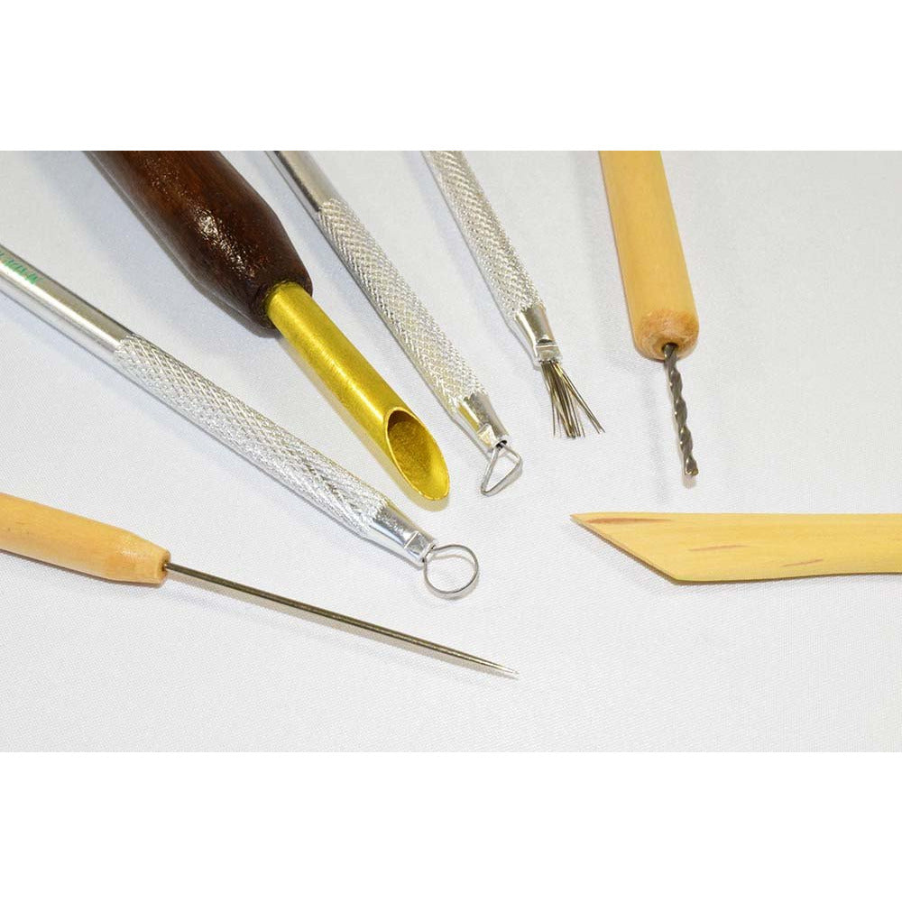 Here’s everything you'll need in a basic sculptor's set. Piercers, cutters, smoothers, shapers in a combination of metal and wooden tools. Also great for art clay, glass work, potters' work, and more.* 7 Pieces, both wood & metal for a variety of different artistic effects * For ceramic clay, wax, polymer clay, glasswork & more * Smoothers, shapers, cutters, piercers, flat and rounded shapes * Wood handles provide easy grip - great for carving, jewelry making, etc. * First time sculpters or experienced professionals will love this complete set