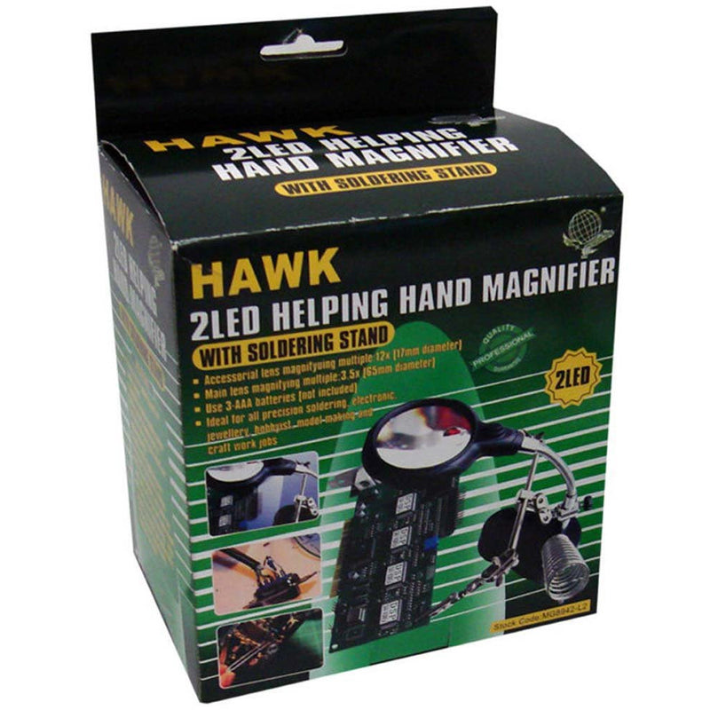 * Large lens has 3.5x power magnification with 12x power in smaller lens* Soldering stand to hold hot soldering iron to prevent accidents- weighted base to balance* 3 AAA batteries needed power LED lights - battery compartment located at bottom* 2 Alligator clamps to hold work securely + 2.5 inch flexible gooseneck to adjust magnifier angle* 2 Bright LED lights to illuminate your work - use push button on lens encasing to turn on/off