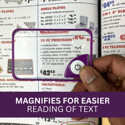 Don’t underestimate this compact powerhouse. Roughly the size of a credit card, this wallet-friendly magnifier is the perfect companion for everyday moments when you need a closer look. Equipped with a distortion-free 1.5x main lens and a 4x diopter lens for finer details, it brings clarity wherever you are. An ultra-bright LED light, activated by a convenient white button, ensures visibility even in dim lighting. Ideal for reading menus, theatre programs, product labels, or any fine print—just slip it into your wallet or pocket and be ready anytime.