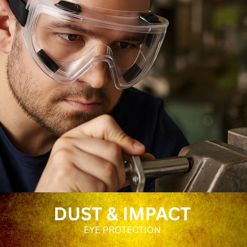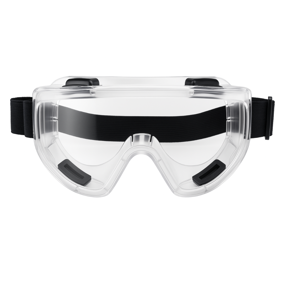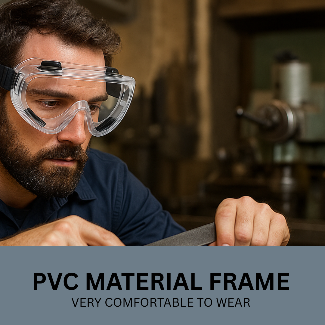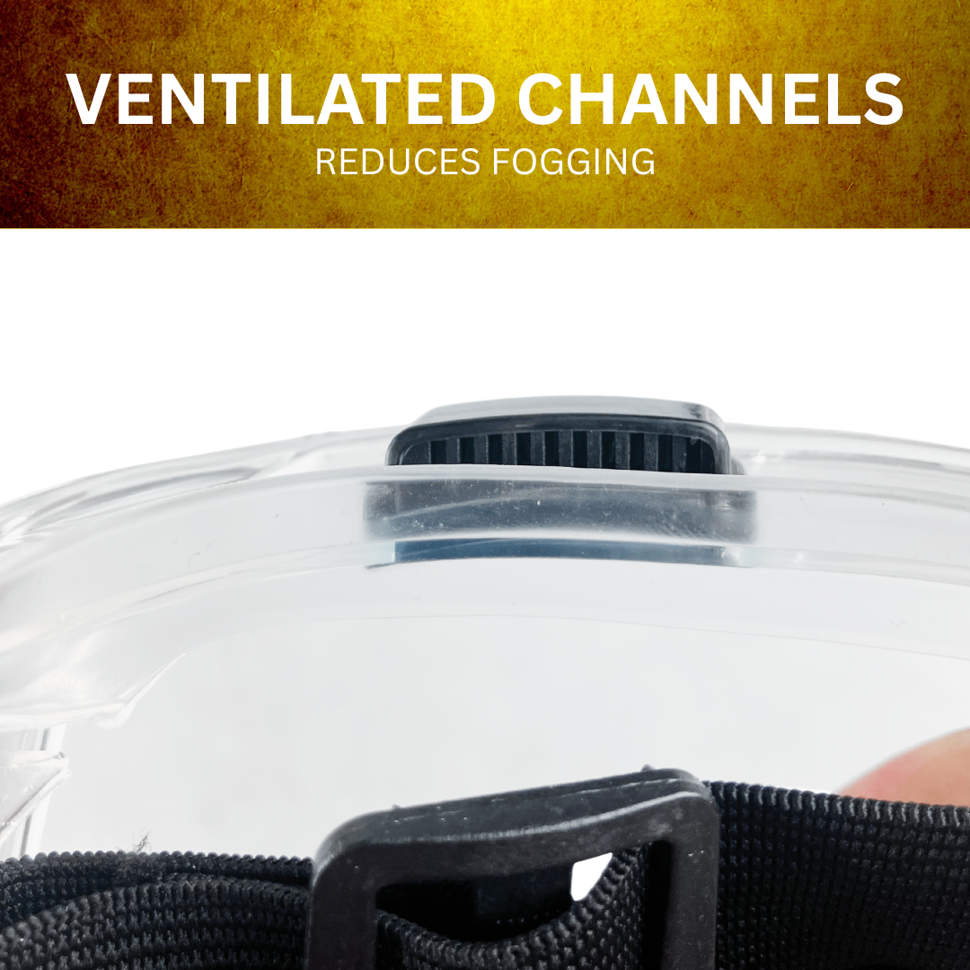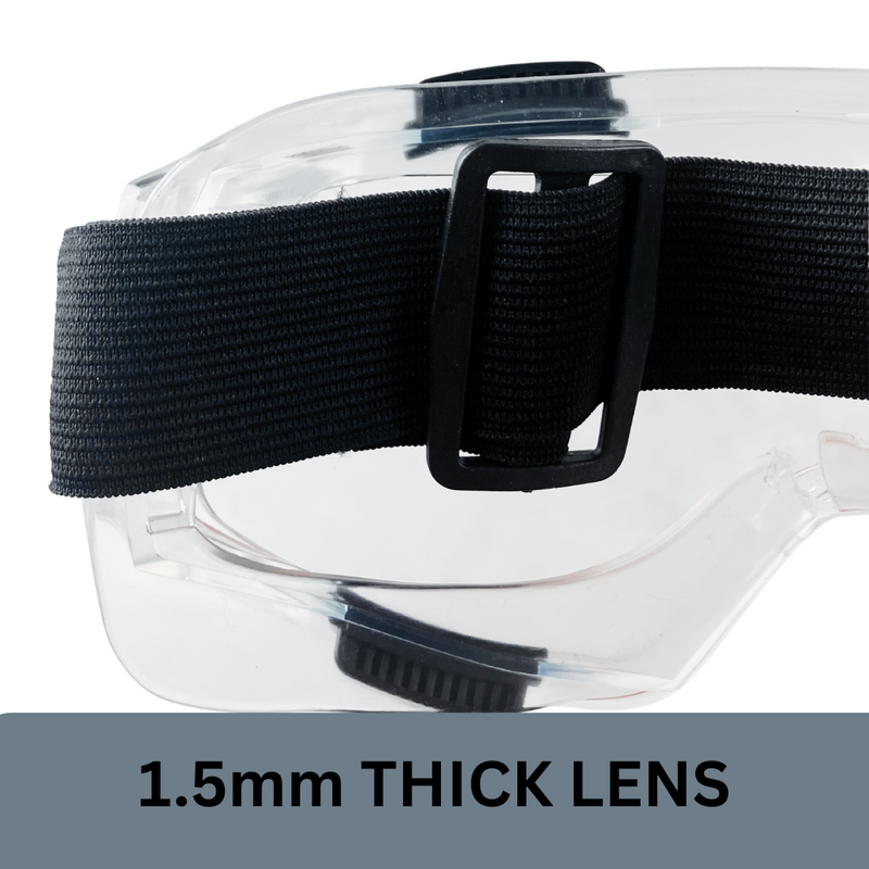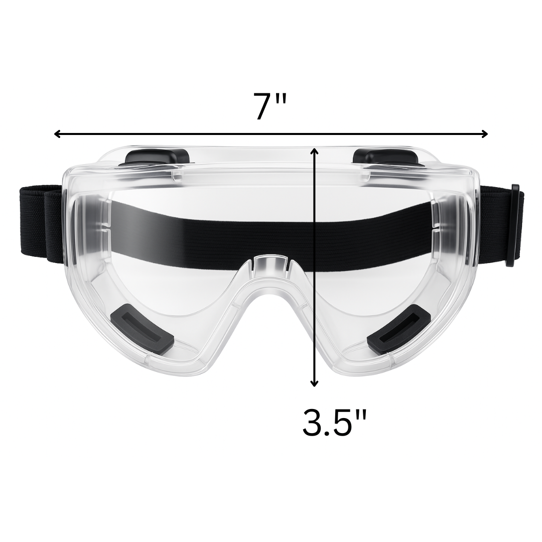 These clear lens goggles measure a full 9 1/2 inches across to provide the greatest amount of coverage, and still give you the greatest field of vision. Plastic that touches the face is soft and pliable, so as to provide comfort to the wearer. These goggles are equipped with air vents to prevent fogging, and they are made to accommodate additional safety equipment, such as a hard hat, hearing protection and breathing protection. A 1.25 inch wide adjustable elastic band holds the goggles in place.* 9.5 Inch length across and 1.25 inches long length- Air vents on sides to prevent fogging * Clear lenses all around for a full, clear field of vision Provides maximum protection with side panels for full coverage - pliable to fit any face * Comfortable elastic band will stretch to fit any head size * Made to accommodate other safety equipment such as hats, respirator masks, and more