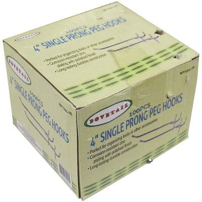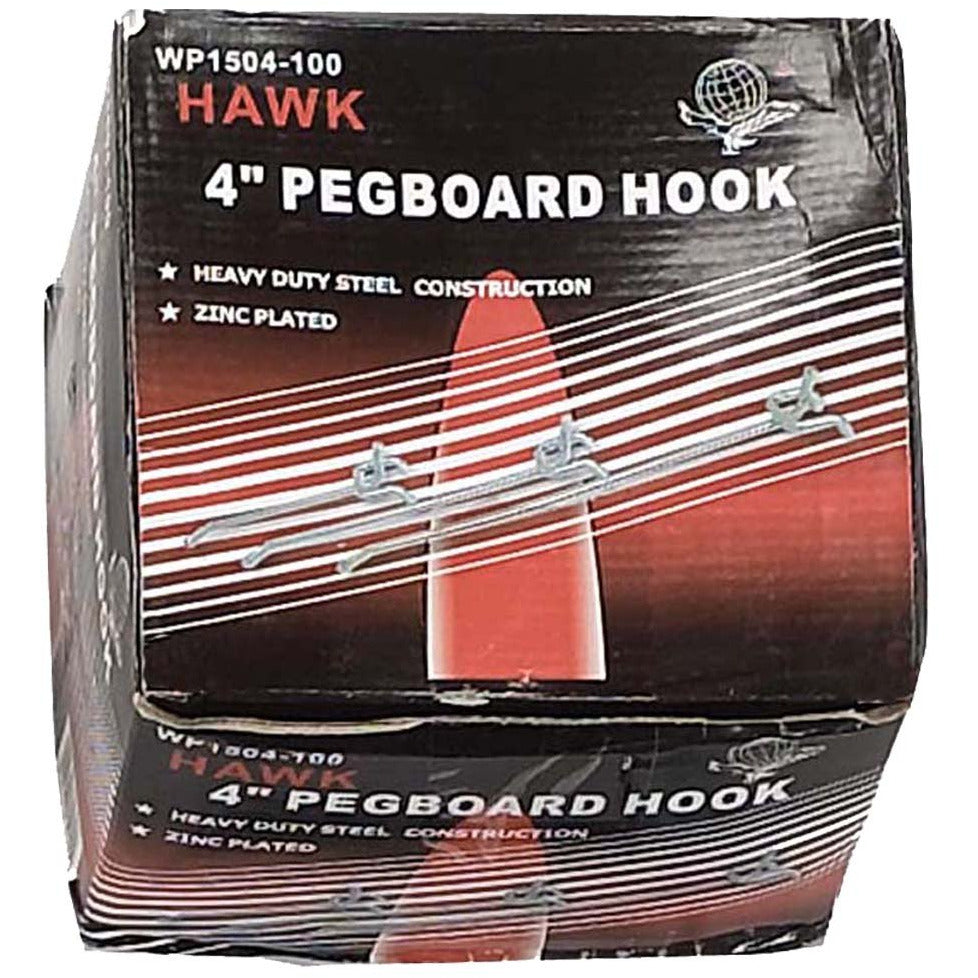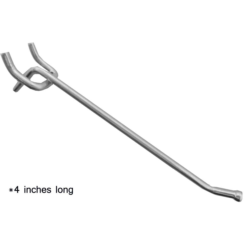 4 Piece Set Of 4" Double Prong Hooks. For Use With Peg Board, These Double Prong Hooks Enable You To Hang Up Many More Types Of Items. Great For Store Displays, But Also A Welcome Addition To Any Workshop. Keep All Your Tools Within Easy Reach.* Bulk size of 100 is great for offices, retail spaces, home decorators, and more * Rounded End To Prevent Injuries and 3-prong Hold For Stability * 6 -Inches long - 1/8-inch thick - galvanized steel * Smaller peg hooks - can hang multiple small objects on it - or good for delicate items * Made to use with any peg board - great for hammers, rakes, etc