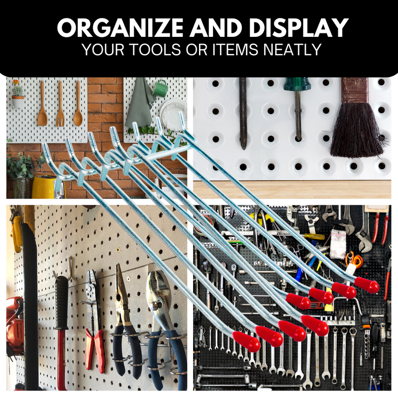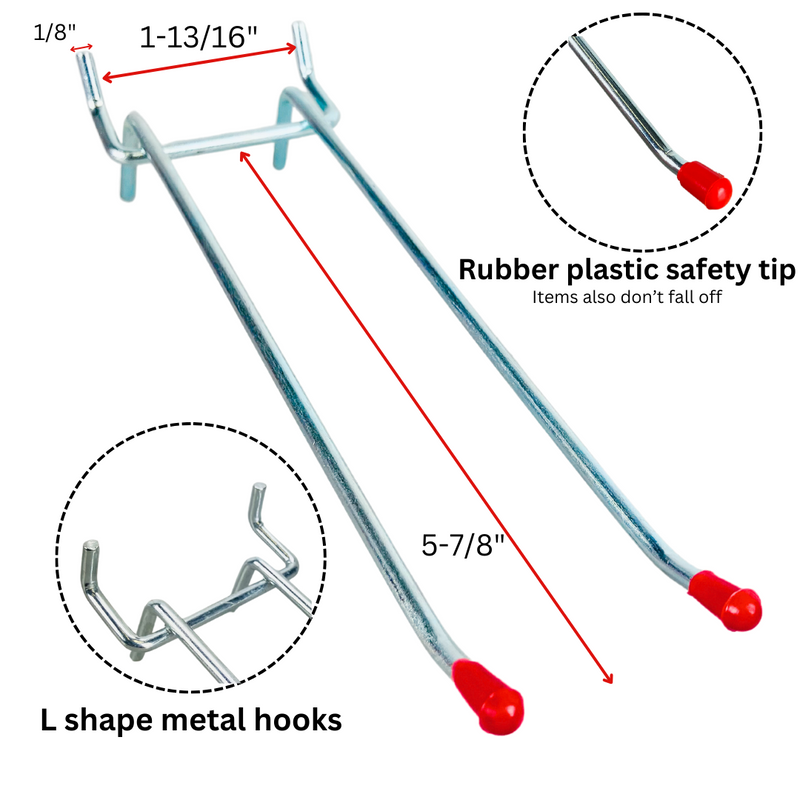 4 Piece Set Of 6" Double Prong Hooks. For Use With Peg Board, These Double Prong Hooks Enable You To Hang Up Many More Types Of Items. Great For Store Displays, But Also A Welcome Addition To Any Workshop. Keep All Your Tools Within Easy Reach.* Package contains 4 pieces - will work great for use in home or work - great for storage areas * Red rubber tips for safety - you won't get hurt & neither will the items that you put on the hook * 6-Inches long - 1/8-inch thick - 1.25 inches distance between prongs - galvanized steel - durable * Long peg hooks - can hang multiple objects on it - or one very large object * Made to use with any peg board - great for hammers, rakes, etc