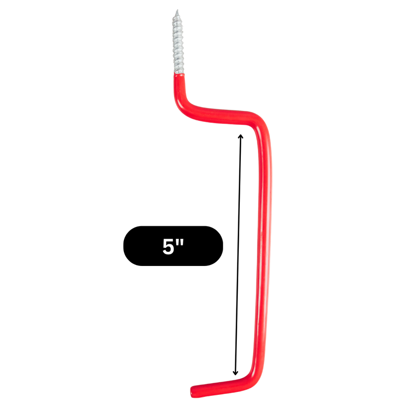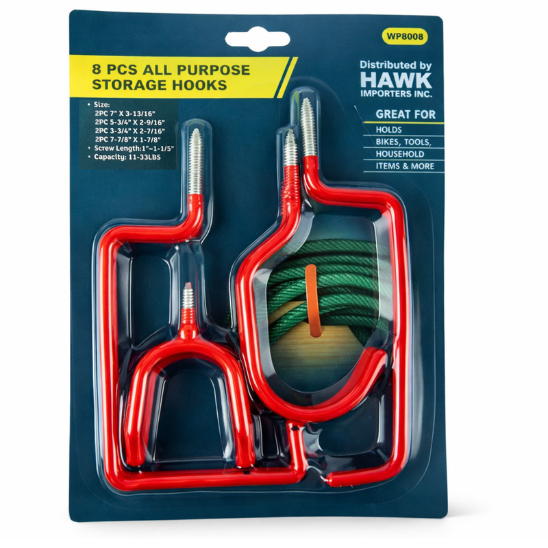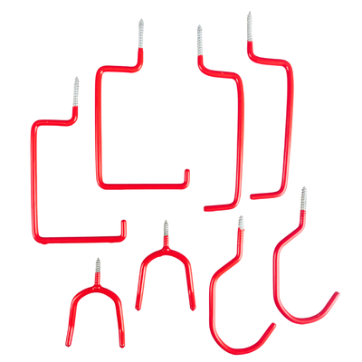 Get organized fast with this versatile 8-piece all-purpose storage hook set, designed to hold everything from bikes and garden tools to cords, ladders, and household items. Each hook features a durable steel core with a bright red vinyl coating to protect your equipment from scratches while providing a secure, non-slip grip.