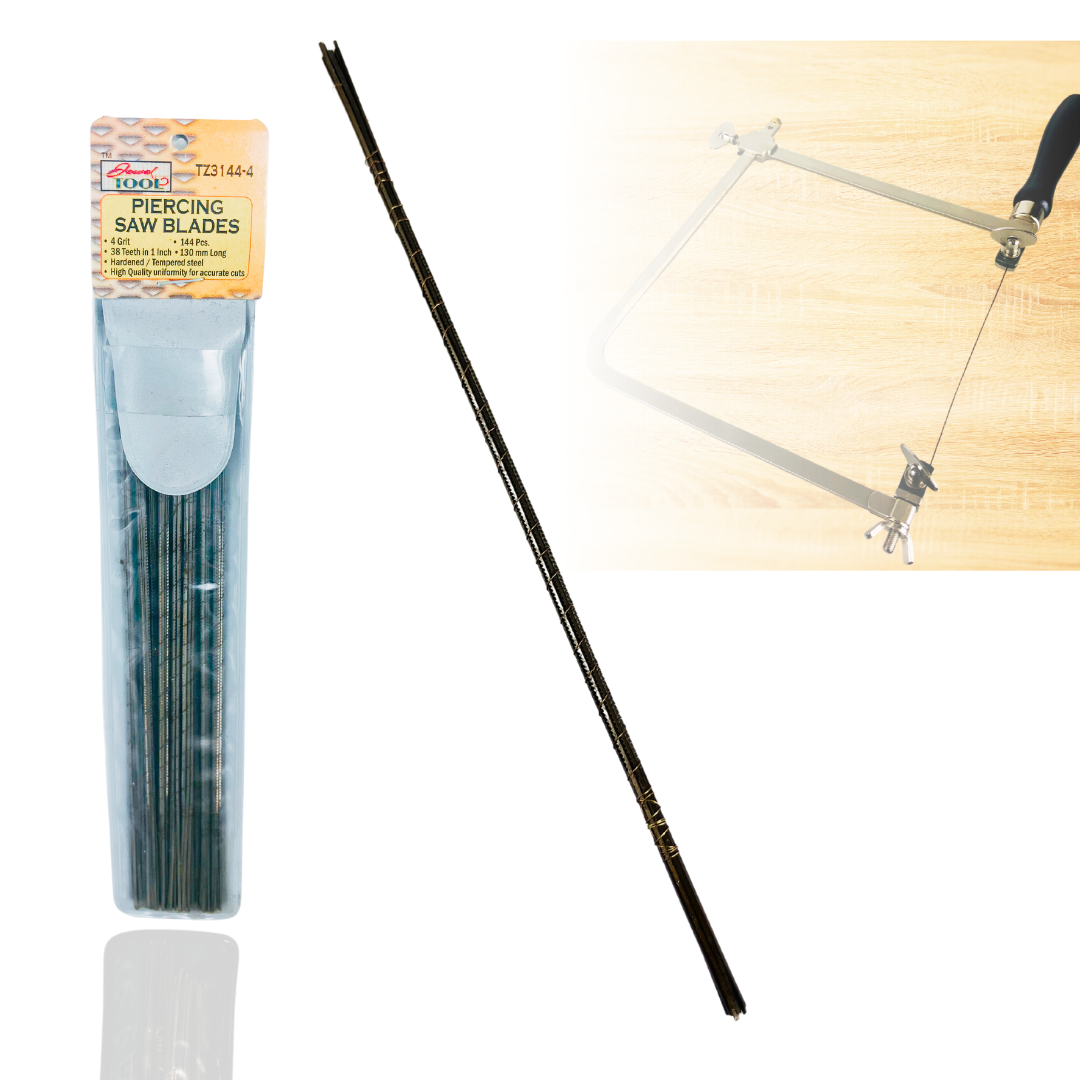 JEWEL TOOL 144 Piece Piercing Saw Blades 4 grit (TZ-43748-86) are tailor-made for craftsmen who demand precision. These blades aren't just confined to metalwork. While primarily developed for metal, these multifaceted blades can also handle wood and plastic, especially when working on models and miniatures. The product stands out for its versatility, making it indispensable for jewelry tasks and other intricate metal applications. Packaged meticulously in a vinyl pouch, the set comprises 144 blades, organized in 12 bundles of 12 each. With a length of 5.25" (13.3 cm), each blade sports a 1" (2.5 cm) blank region at both ends, facilitating seamless attachment to a frame. It's advisable to employ an adjustable jeweler's saw boasting a wooden handle for optimal results with these blades. Crafted from hardened and tempered steel, the durability and strength of these blades remain unparalleled. A hallmark feature is the 38 teeth per inch (15 teeth per cm) uniformly made across the blade's length, ensuring impeccable and accurate cuts every single time.