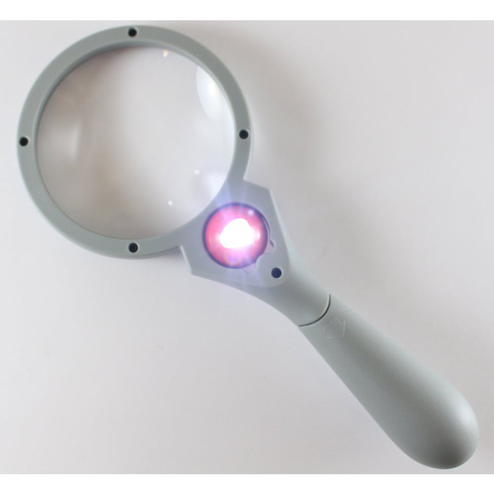 This all gray magnifier set is premium quality - included you will receive a 3x/5x LED hand magnifier with 1.5x/4x magnifier pocket magnifier for those times you are traveling. These magnifiers are attractive as they are functional. The distortion free, aspheric lens on the hand magnifier measure 3.5 inches in diameter and offers 3x and 5x power magnification. The black colored ergonomic handle features a red "roller ball" which allows the CREE LED light to move almost 180 degrees. These lights are very bright and can be pointed exactly where desired. They require 2 AAA batteries which are not included. Ergonomic wide handle allows for comfortable and easy grip. Handle and rim are one unit so the magnifier is sturdy and can sustain drops. The pocket magnifier is ideal for when you are on the go - great to read price tags, restaurant menus, receipts, etc. Sized to almost a credit card - 3.5 inches by 2.125 inches. Distortion free lens has a 1.5x magnification power and the diopter lens (smaller lens) is 4x. The white button active the ultra-bright LED light so you won't miss a thing.* Hand Magnifier - 3x/5x - 3.5 Inches Diameter - Bright Cree Led Light * Ergonomic Wide Handle Allows For A Comfort Grip - Led Light Requires 2 Aaa Batteries * Hand Magnifier Has High Quality Aspheric Lens - Offers Distortion Free Magnification * Pocket Magnifier -sized To Almost A Credit Card - 3.5 Inches By 2.125 Inches - Lighted * Pocket Magnifier Has Distortion Free Lens With1.5x Magnification Power - Travel Friendly!