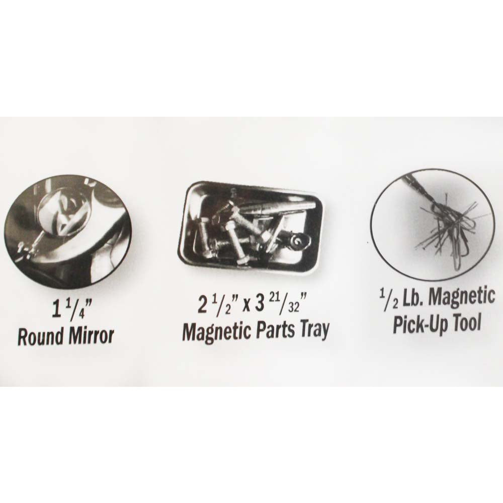 This set is great for any mechanic working on an engine. It comes with two extendable tools; a 1-1/4 inch diameter mirror and a 1/4 inch magnetic tip. Also included is a magnetic hardware tray, to keep all nuts, bolt, and screws from rolling away while you disassemble and reassemble your work.* This Entire 3 Piece Set Is Made Of Chrome Plated Stainless Steel-weighs 6 Ounces * The 1-1/4 Inches Diameter Mirror Has A Jointed Neck To Work At Any Angle And Extends To 19 Inches * The Magnet Extends To 25 Inches And Is Equipped With A 1/2 Pound Capacity * Both The Mirror And The Magnet Have Pocket Clips For Convenient Access Any Time * The Magnetic Tray Is 3-1/2 X 2-1/2 Inches-stays Put In Any Position-even Upside Down