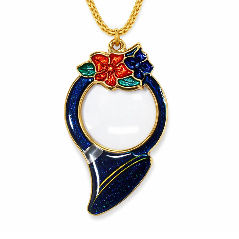 This elegant magnifier necklace features a beautifully enameled French horn design accented with festive holly berries, making it a thoughtful gift, holiday stocking stuffer, or everyday accessory. Discreetly built into the design is a 3.5x magnifying lens, perfect for reading small print while on the go. Finished with a matching gold-tone chain, this piece blends functionality with classic style.