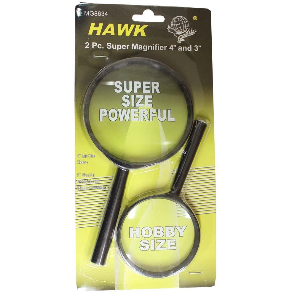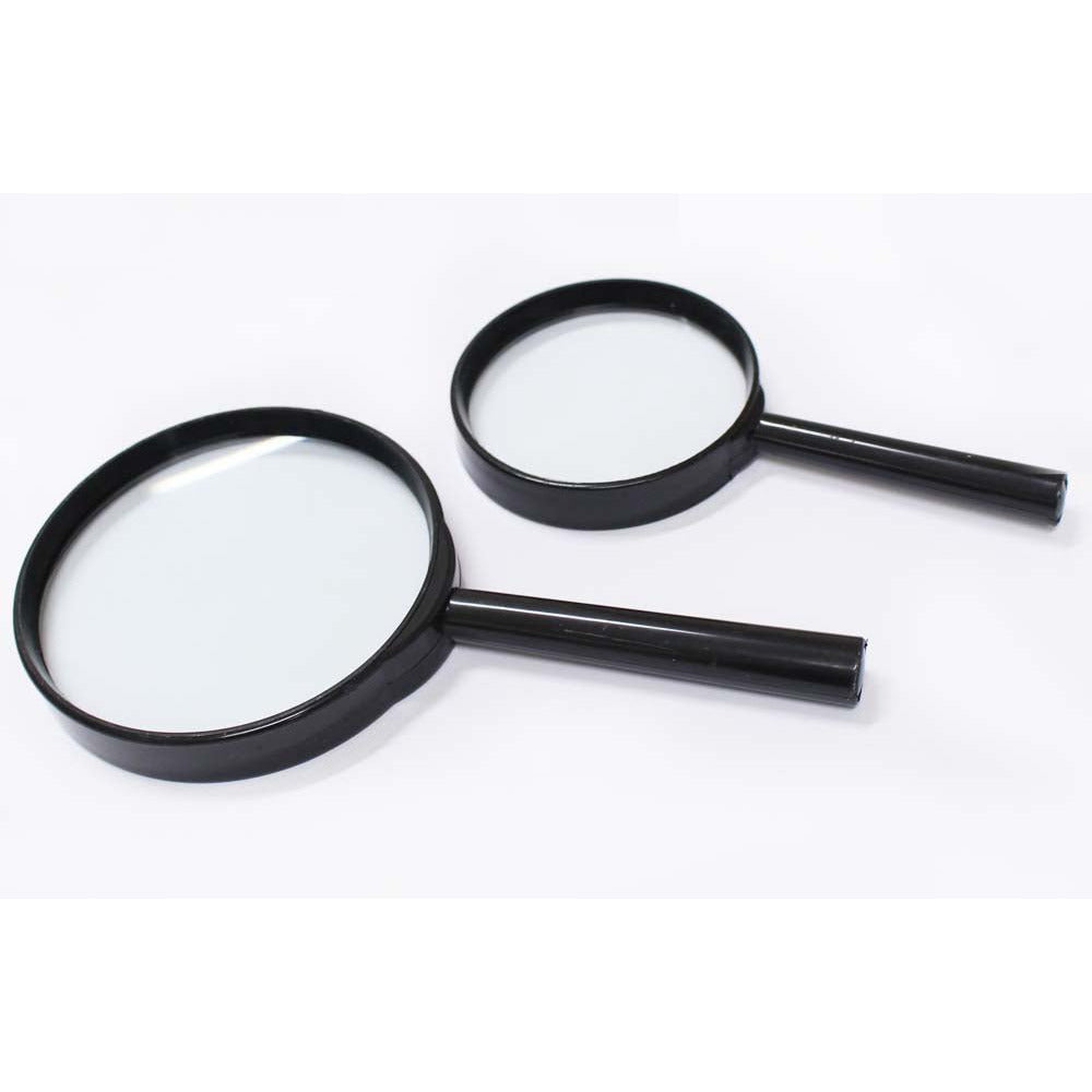 Two For The Price Of One! They come in two sizes. One is 3 Inches and one is 4 Inches in diameter. Both magnifiers have 2X power magnification. One for home, and one to take with you. They both have glass lenses with black plastic frames.* 2 Handheld style glass lens magnifiers with 2X power * 3 Inch diameter and 4 inch diameter with plastic frames * Magnifiers are 6-1/4 and 7-3/4 inches respectively, and the set weighs 9.9 ounces * The black plastic frames are sturdy and durable-great for collectors and everyday reading * The glass lenses are without distortion when you view