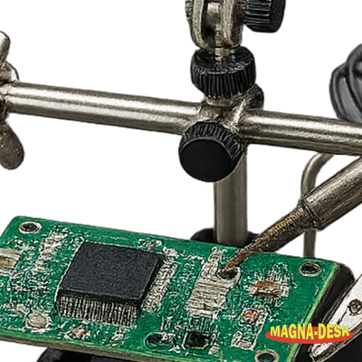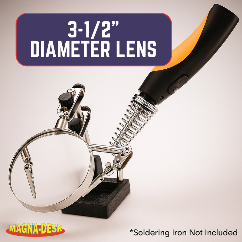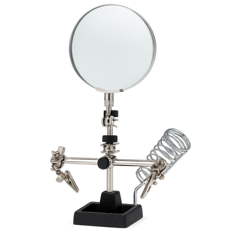 The Helping Hands Magnifier with Alligator Clips is one of the most useful tools you can keep on your workbench. Standing approximately 8 inches tall, this multi-purpose station features a large 3.5-inch 2X magnifying lens for enhanced visibility, dual adjustable alligator clamps to hold your work securely, and a coiled soldering iron holder conveniently mounted near the magnifier.