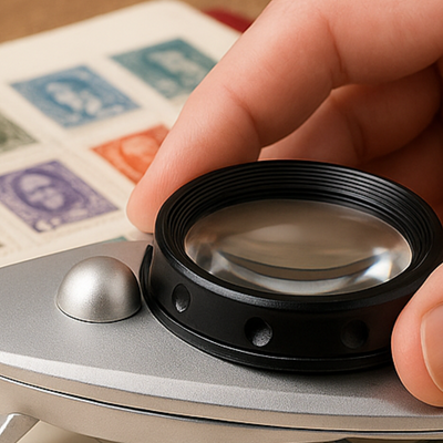 This magnifier is great for working with jewelry, and also for stamp and coin collectors. It has 10x magnificaiton. You can hold it in your hand or stand it up on a table for close-up study. It measures approx. 5" x 1.75", and has two folding legs for hands-free viewing. The lens is approx. 1" in diameter. Takes 4 button batteries which are included.
