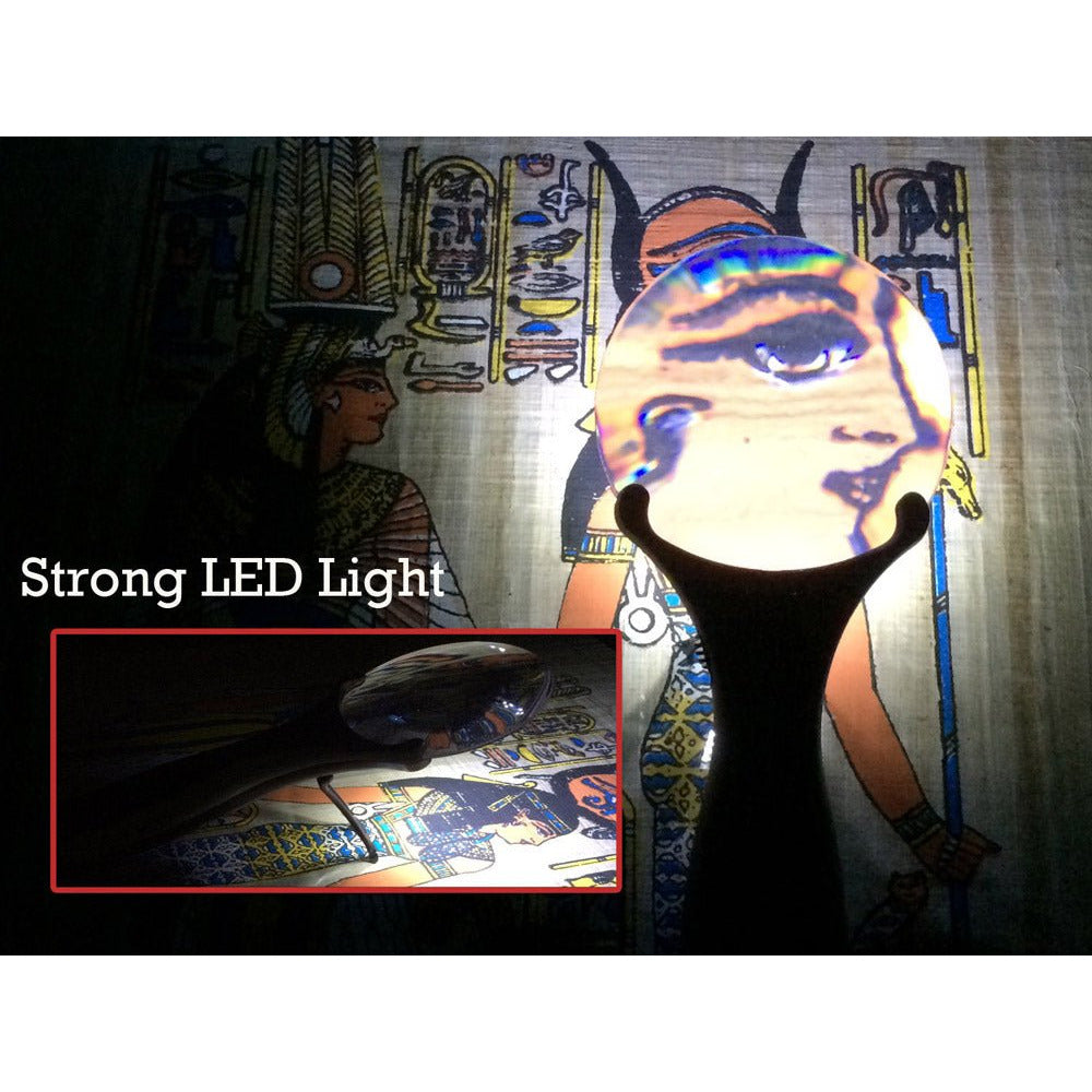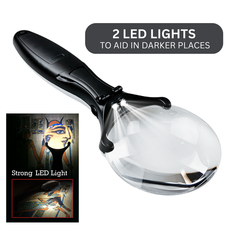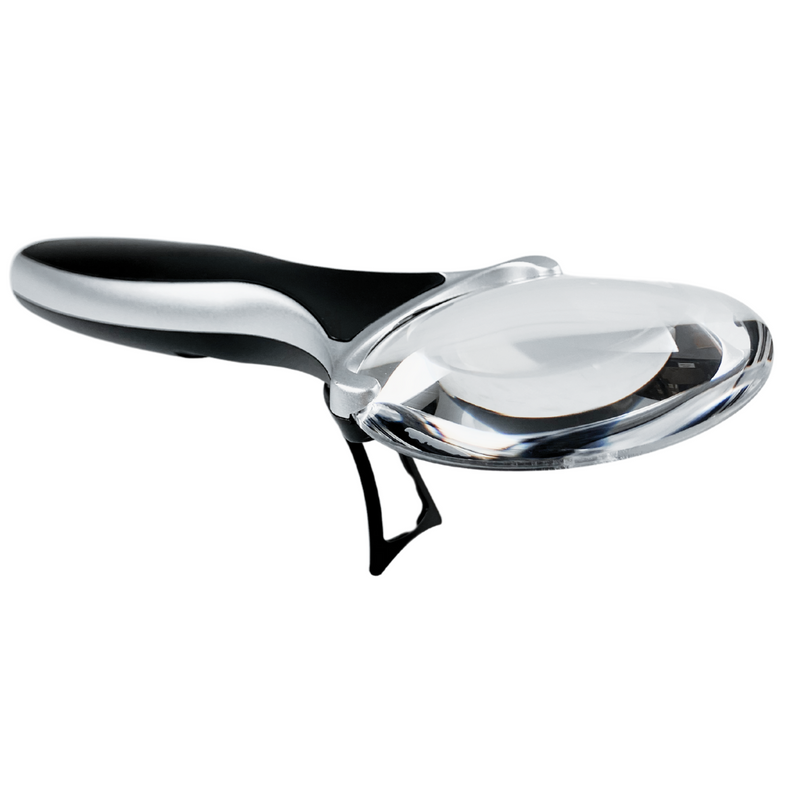 This Is A Very Beautiful, Sleek And Modern Handheld Magnifier. The Black And Silver Look Is Very Elegant, And The Magnifier Has Two Powers: 2.5x For The Large Lens, And 4x For The Small Inset Lens. This Magnifier Is Equipped With 2 Ultra Bright Led Lights, And Takes 2 "AA" Batteries. (not Included). This Magnifier Has A Small, Fold-down Stand To Hold It Away From The Table Top.* 2.5x Main lens / 4x small lens *3 inch diameter rimless lens with 5 inch ergonomic handle * 2 Ultra bright LEDs that help view fine detail * Fold out stand provided in magnifier to help fix focus on an object * Needs 2 "AA" batteries which are not included