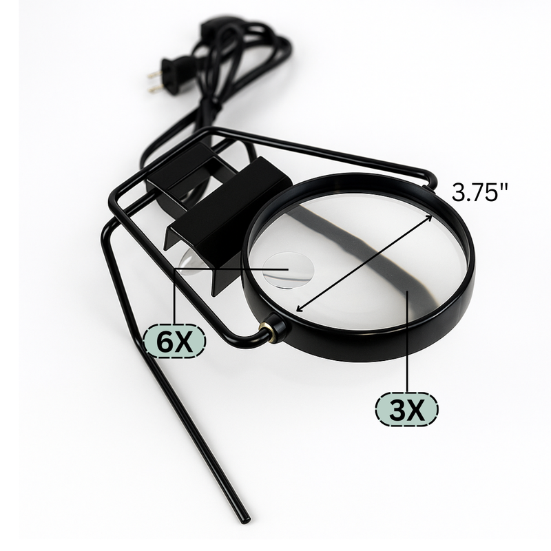 The perfect take-along magnifying lamp! Crafted from durable black metal, it features a large 3.75" glass lens with 3x magnification and a built-in 3/4" macro portion with 6x power for fine detail. A strong replaceable bulb provides bright, steady light, and the UL-approved cord includes a convenient on/off switch. With its sturdy construction and versatile design, this lamp is ideal for hobbyists, crafters, and professionals alike.