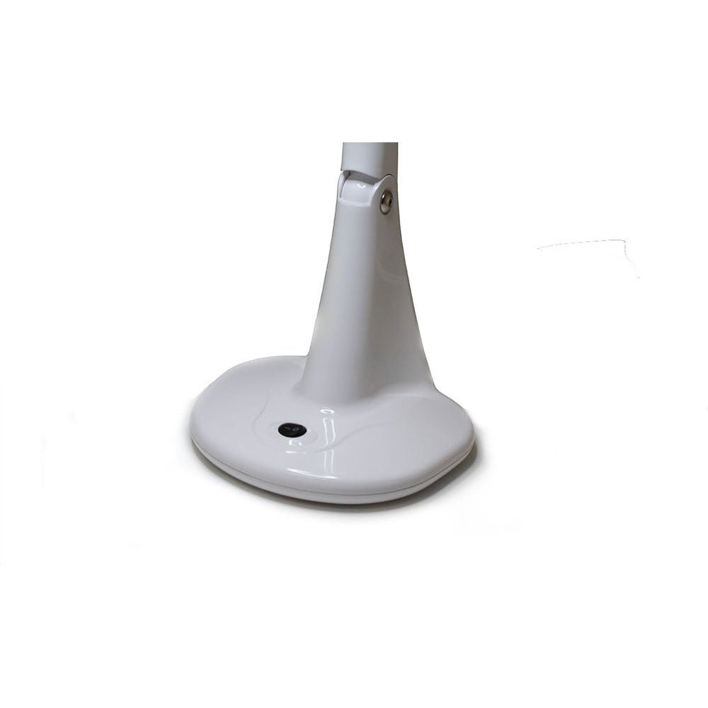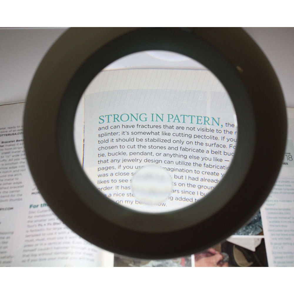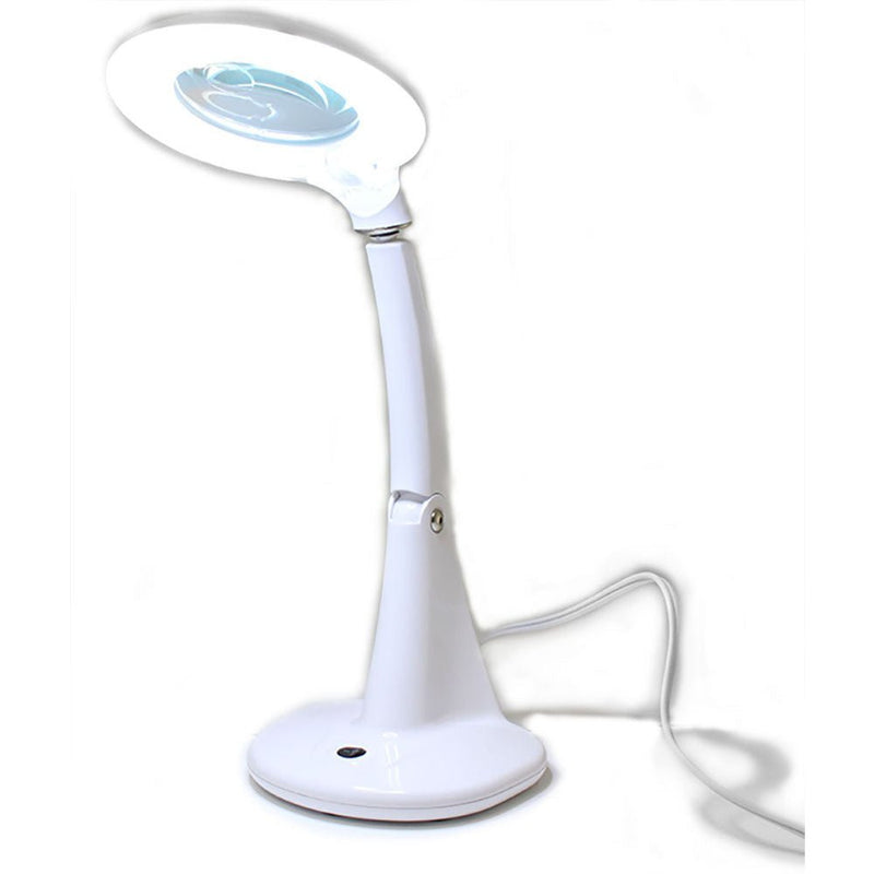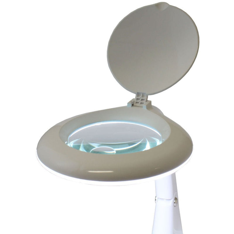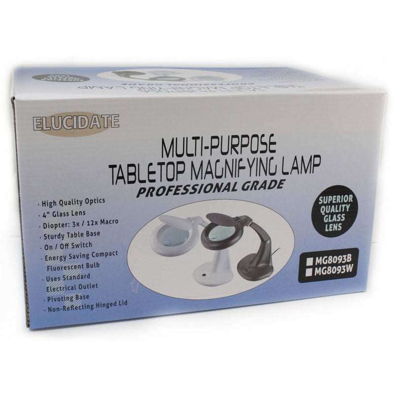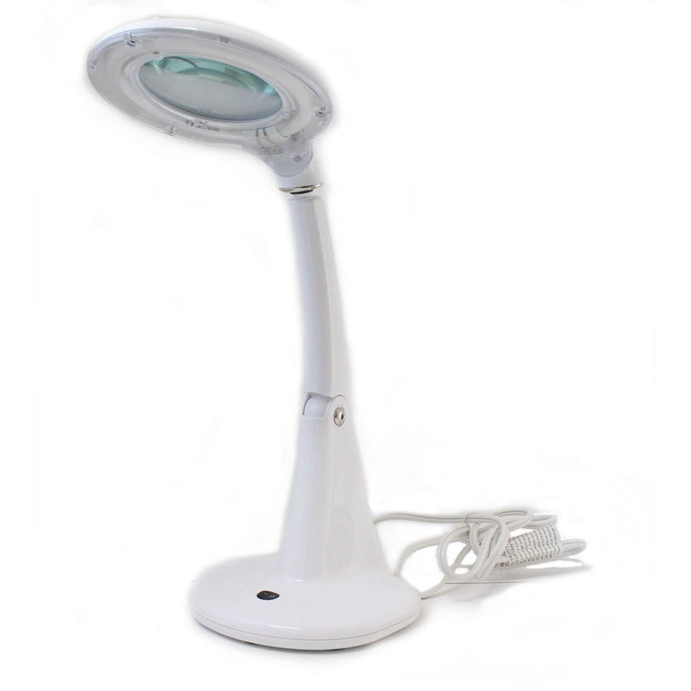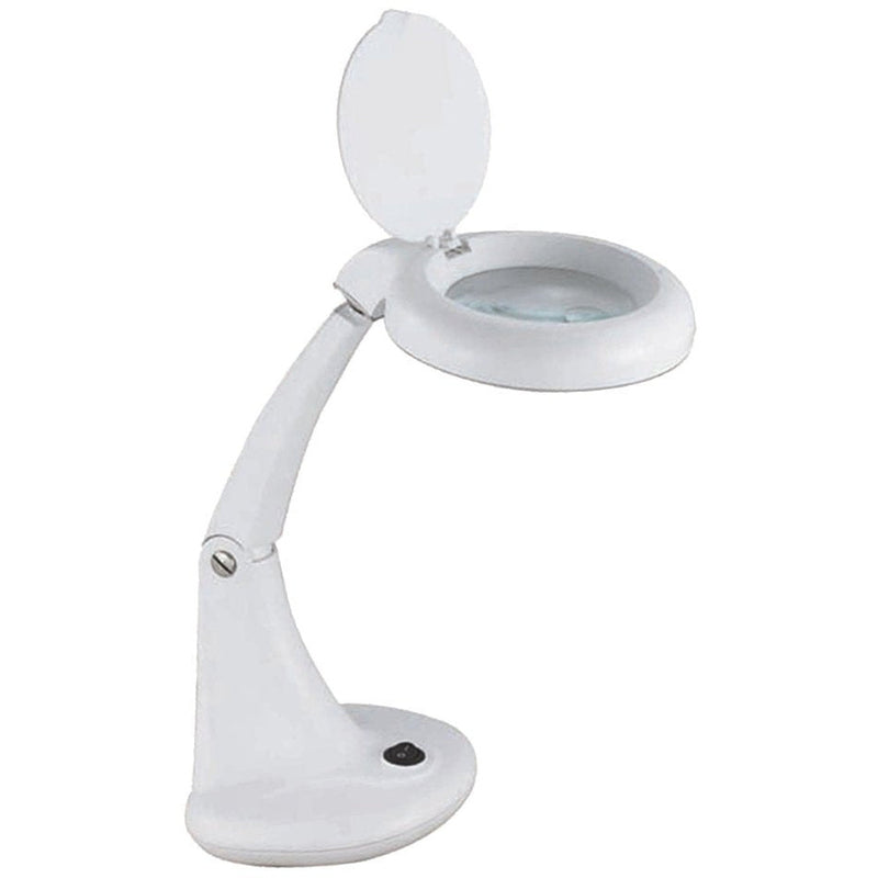 Modern and stylish, this magnifying light has an adjustable neck and a powerful glass lens which gives you 2 powerful options: 3 1/2" 3x and a 1" 12x macro. Light lid closes to direct the powerful fluorescent lamp, lifts to expose magnifying lens. Plugs into any 110v standard outlet. Neck is hitch socket to freely move, and the arm is bendable to 80 degrees. Overall about 15" tall. Great for beauticians and manucurists. Plastic lamp base.Sleek, clean & modern looking - looks great on any table! Heavy weighted base for stability | stands approx 14" tall when fully extended Jointed on the head and the neck, this lamp will adjust to angles you need 3x power in the 3-1/2 inch lens, and 12x power in the macro lens Round shaped fluorescent bulb plugs in easily and is replaceable | unit weighs a light 3.20 lbs