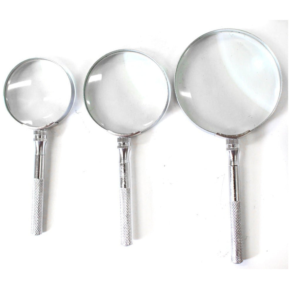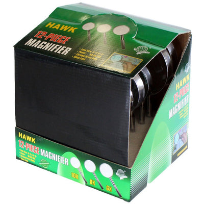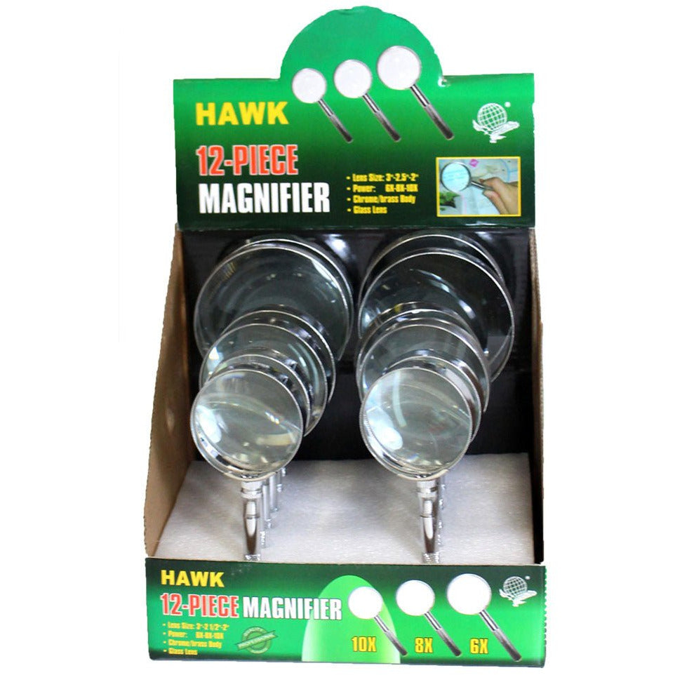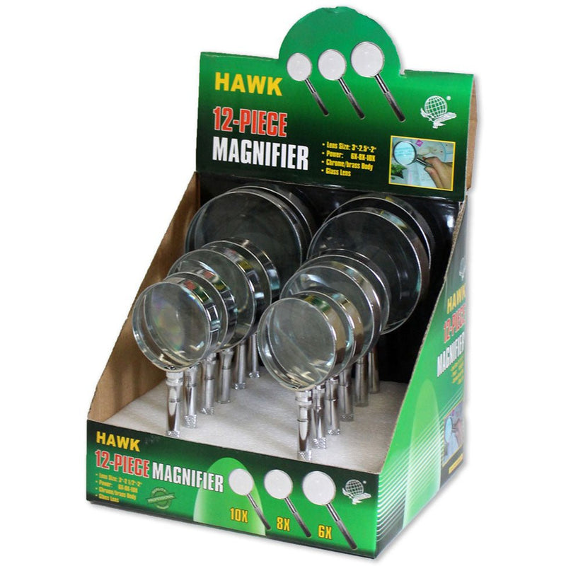 A set of general purpose handheld magnifying glasses with a clear plastic display stand. Comes in set of 12pcs in three popular sizes. An eye catching display for your counter-top that will gets lots of attention from your customers* 12 pieces in set * Chrome plated * 4 Pc. Of 2" diam., 3.5x * 4 Pc. Of 2.5" diam, 3x * 4 Pc. Of 3" diam, 2.5x
