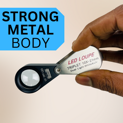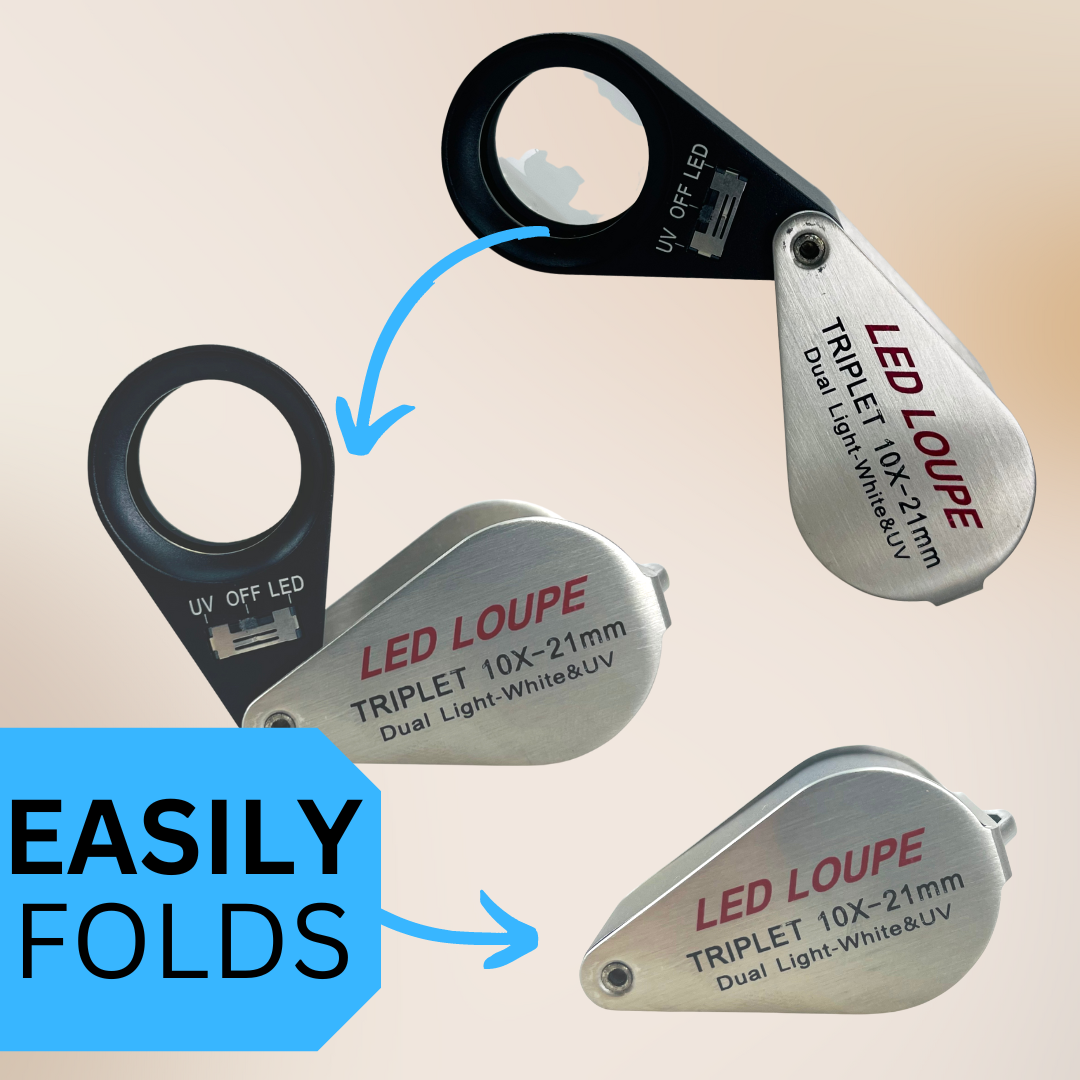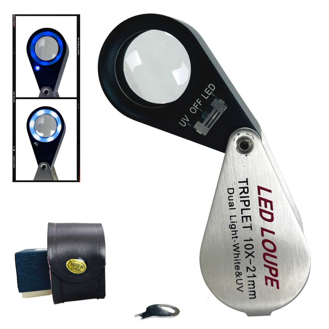 This Is The Jeweler's Loupe You Have Been Waiting For! This One Truly Has It All! This Led Loupe Has Two Light Options: Both White And Uv. The Distortion-free Triplet Glass Lens Has 10x Power Magnification, And It Comes In The Classic "tear Drop" Swivel Case Design. You Even Get A Handy Leather Snap Pouch To Carry It In, And A "key" To Open The Battery Compartment Easily When Needed.* 10x Triplet magnifies 1000%; 21 mm diameter quality glass lens allows you to see distortion free * Dual light system - LED and UV lights are turned on by a simple switch located on neck of loupe * 2 LR-927 button batteries are included and are placed on the backside neck of the loupe * Weighs 2.020 Oz; frame of loupe is made of durable plastic and body encasing is made of steel * Complete with a smooth brown leather case for storage