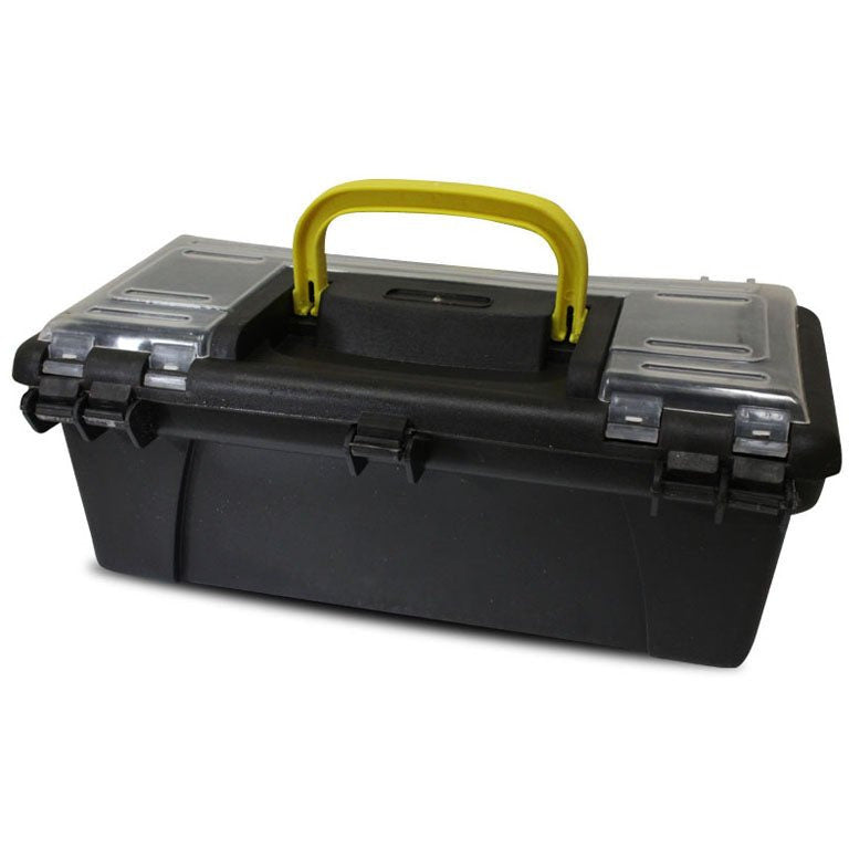 Small enough to be kept in the trunk of the car for emergencies, yet big enough to hold what you need. Inside reveals a storage compartment for larger items and the lid has additional storage space. 10 inches x 4.5 inches x 4 inches. Black with yellow snap closures and yellow handle.