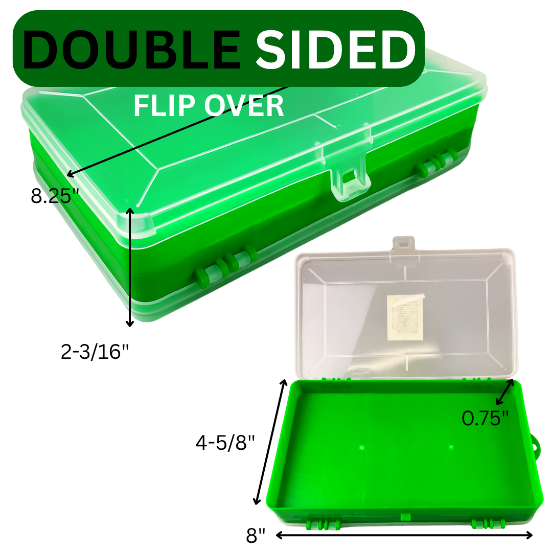 Perfect To Store Small Parts, Beads, And Craft Supplies, Or Even To Take For A Day Of Fishing! This Two Sided Box (Each Side Opens With Its Own Lid) Has Multiple Sized Fixed Compartments (11 On One Side, One Large One On The Other. Dimensions of The Size with 1 Large Compartment: 8-1/8 Inches Long x 0.75 Inches Deep x 4.75 Inches Across. Dimensions of Large Compartment of Side with Multiple Compartments: 1-3/8 Inches Across x 4.75 Inches Tall x 1 Inch Depth. Dimensions Of Box Are: 8 1/4 X 4 3/4 X 2 Inches.* This box measures 8-1/4 across x 4-3/4 wide x 2 inches tall and has a separate lid on each side * One side of the box has a single large section & other side has 11 compartments in various sizes * Each side has its own snap down removeable lid with plastic hinges * Lids are see-through for easy viewing of contents and contents won't mix when lid is closed * Great for sorting and storage of small items - buttons, beads, sequins, craft items and more