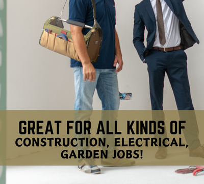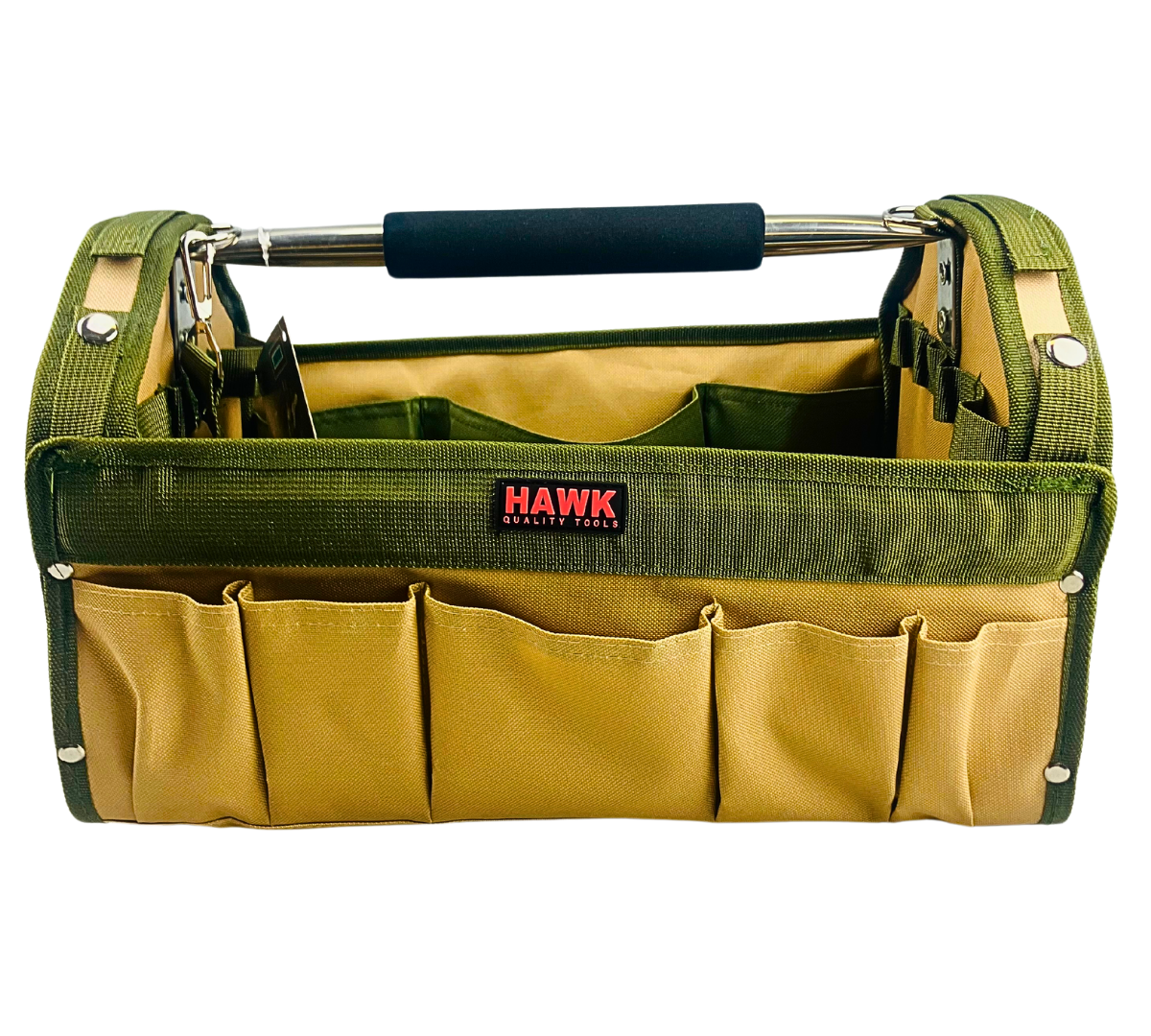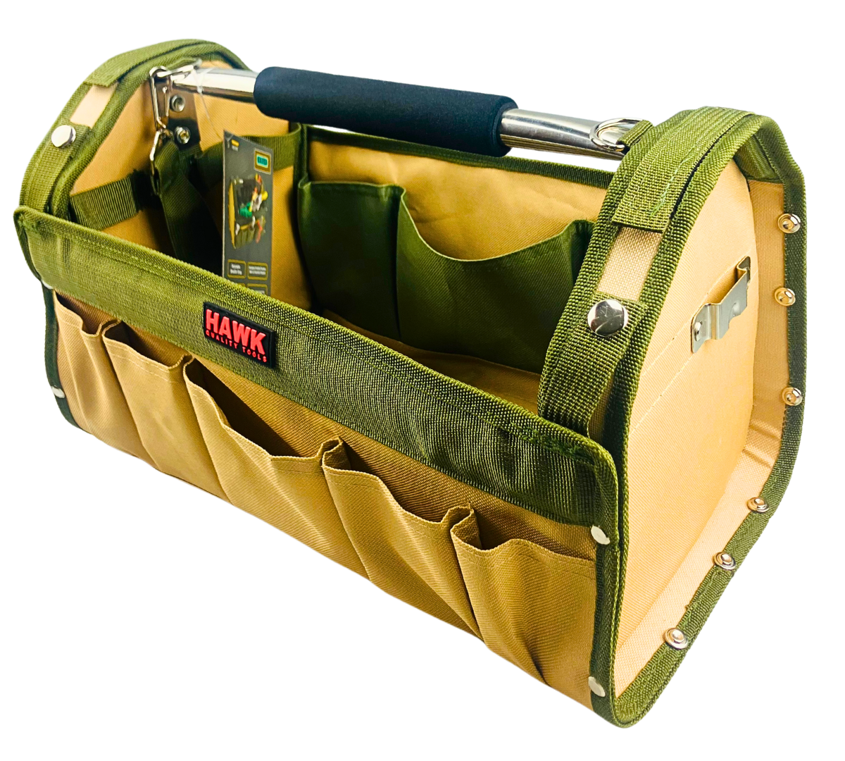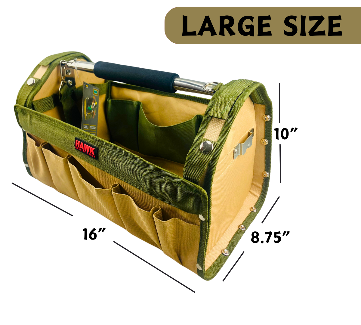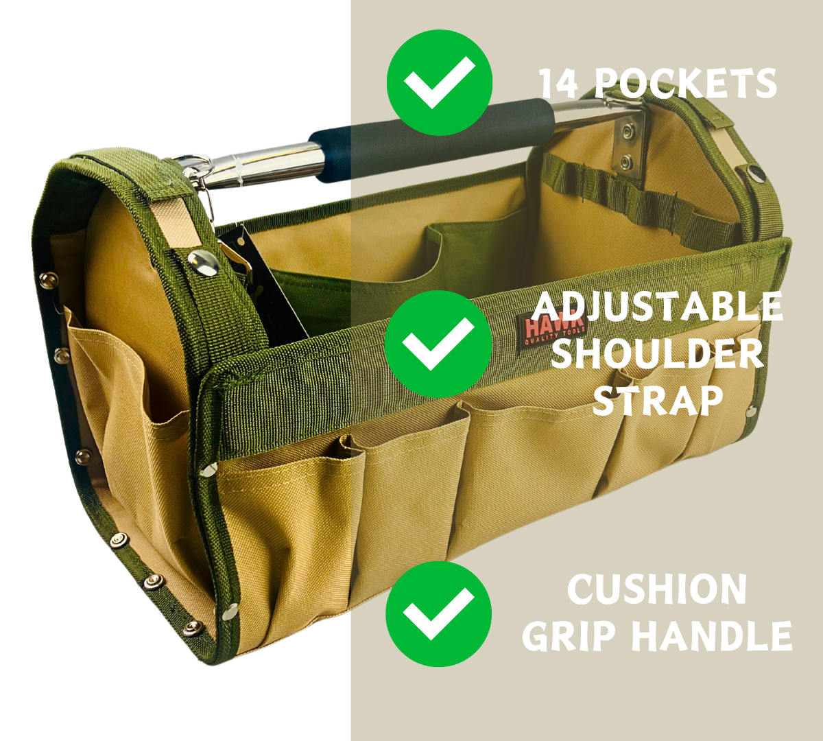 Extra Sturdy Toolbag With 10 Pockets All Around The Bag, And 4 More Inside. Large Roomy Area Inside Bag. Metal Handle For Carrying, Or The Bag Also Has A Shoulder Strap.* Bag Measures 13"x 7"x 9.5" * 13" Padded Metal Carrying Bar * Bag Has 14 Pockets & An Open Top * Large storage area inside bag * Pockets all around the outside of the bag, and more inside