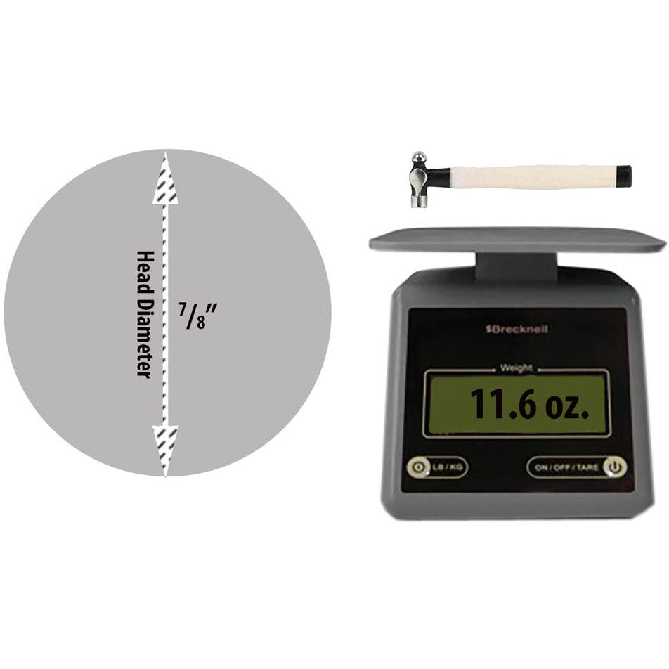 This is a ball pein hammer, which means it has a flat and a rounded head that's 3-1/4 inches longThe flat side has a striking surface of 7/8 inches, and is great for flatteningThe rounded end has a striking surface of 7/8 inches, and will bend wireA beautiful, smooth as silk, 9" painted wooden handle - it's a pleasure to useThis is a well balance, drop forged steel tough hammer - it will do the job right for you