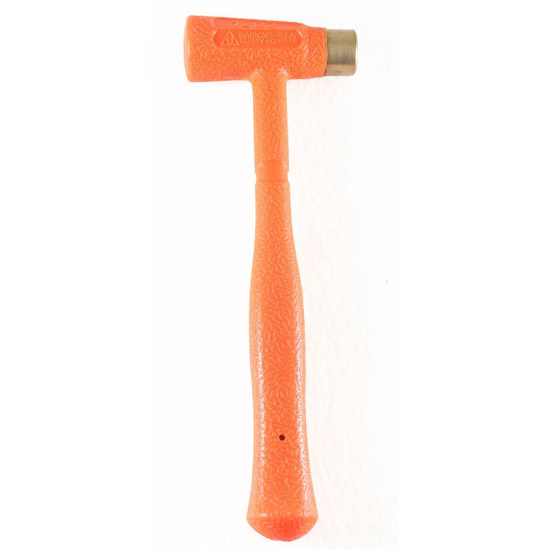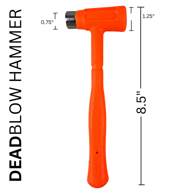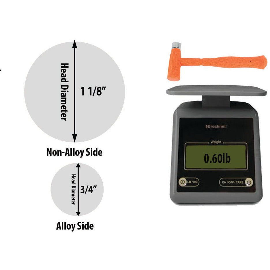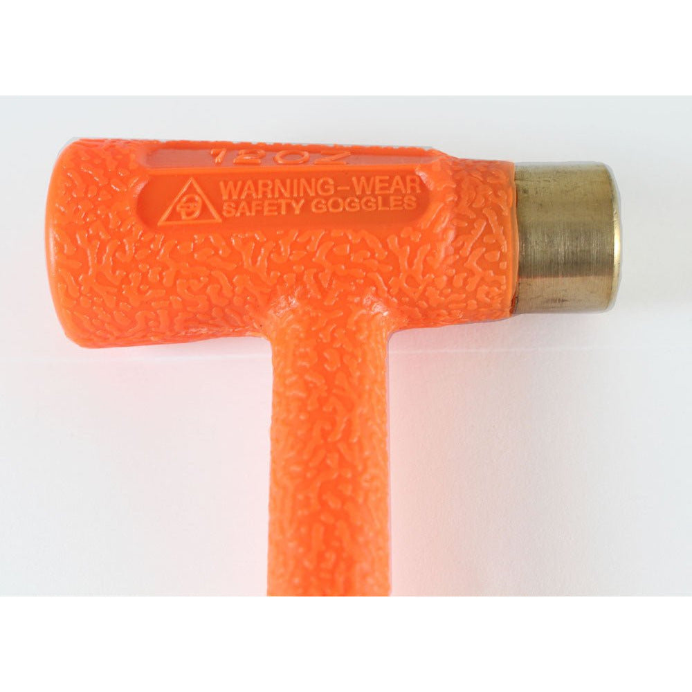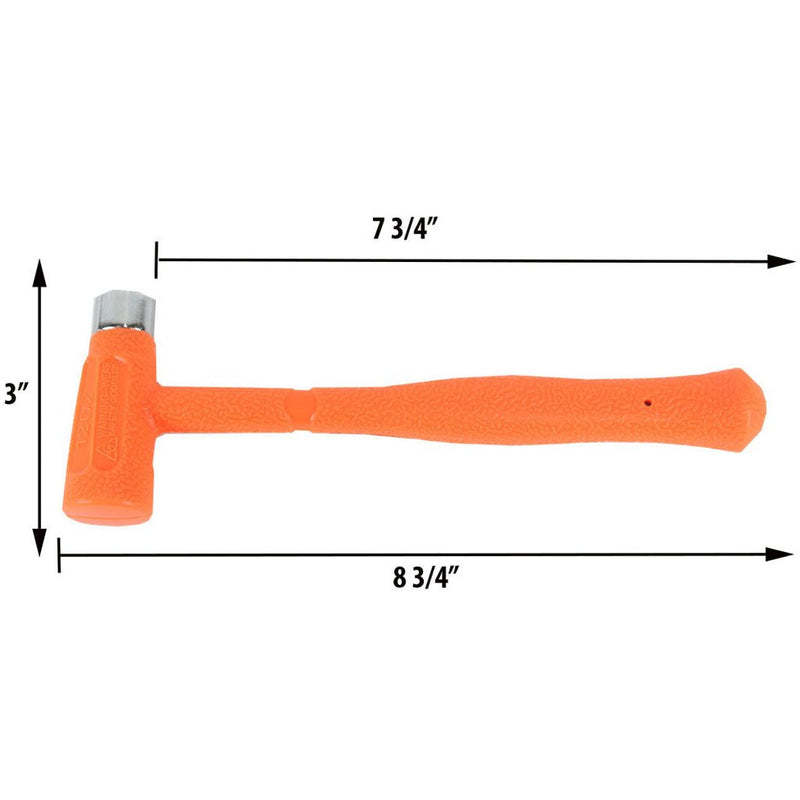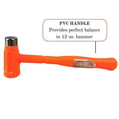 This orange dead blow hammer is perfect for leather or wood work - the strong one-piece pvc construction will protect your surface and still give you maximum strength. One-piece construction with an easy-grip, ergonomic handle. Head weighs 12 ounces. Overall 8-3/4 inches long with 3/4 inch diameter alloy head on one side and 1-1/8 inch PVC coated head on the other.This hammer is 8-3/4 inches long, with a head width of 3 inches Weighs 12 ounces, and has an easy to hold, ergonomic handle This hammer features a dual head, PVC side is 1-1/8 inches, and alloy side is 3/4 inches PVC 7-3/4 inch handle makes this hammer easy to hold and easy to hang on to- non slip surface This hammer will not scratch or cause sparks-perfect for many tasks
