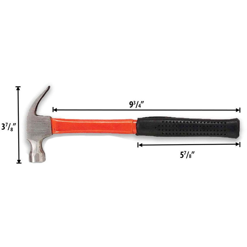 This hammer is 11-1/4 inches long overall, with an 8 ounce forged metal head and a 9-3/4" handleThe handle is bright orange fiberglass-you won't have any trouble finding itIt hammers nails, of course, but the claw end is great for demolition as wellApprox. 5-7/8" of the handle is rubberized for your comfort as you work, also acting as a shock absorberThis heavy duty hammer will look great hanging from your tool belt, or in your tool box
