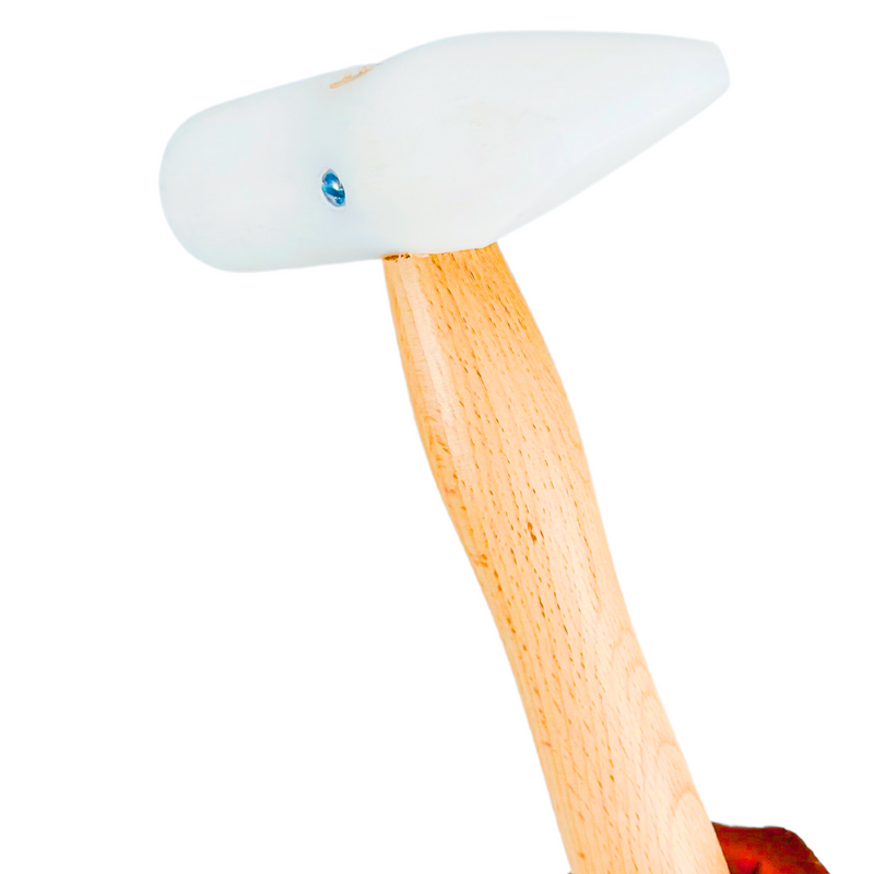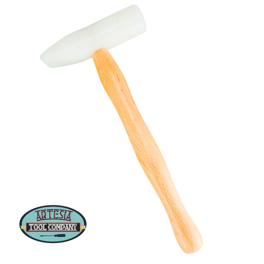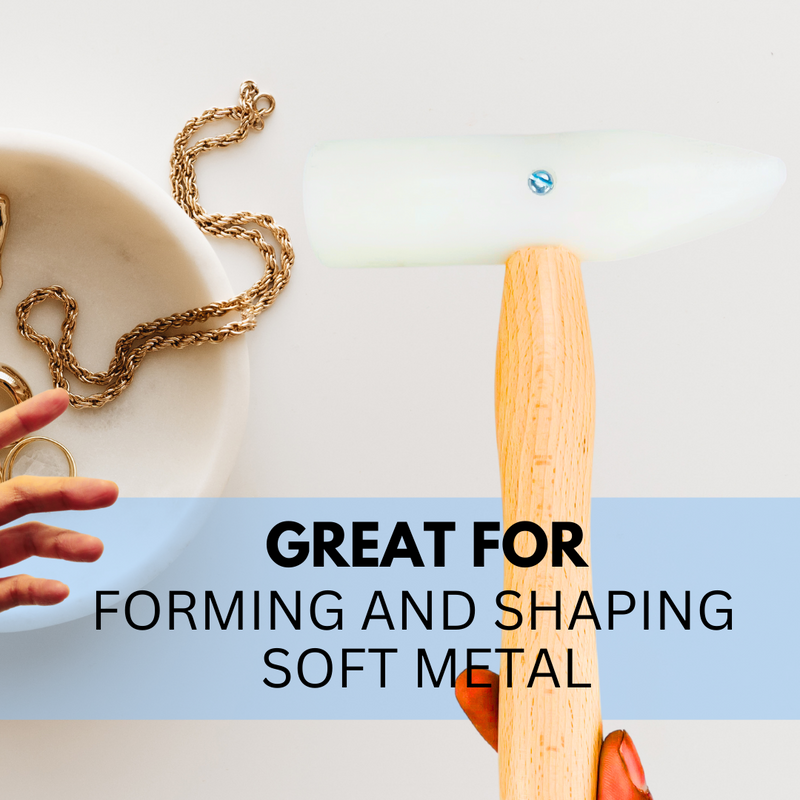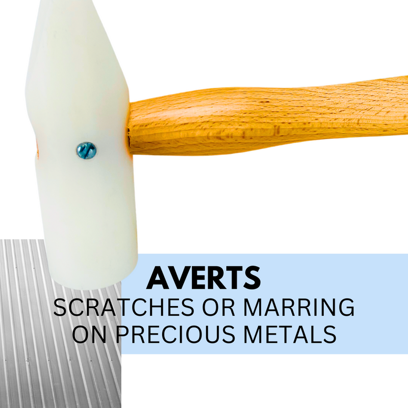 When a gentle touch is needed, this is the hammer you will reach for time and time again. The nylon head will do the job without any damage to precious metals.The solid wood handle is as smooth as silk, and makes this hammer a genuine pleasure to work with.Overall length: 10-3/4" 1-1/4" Striking surface provides perfect surface area for hammering Overall hammer head length is 4-3/4" Weight of hammer is approximately 0.40 lbs