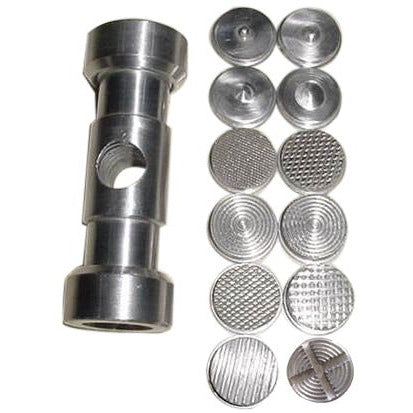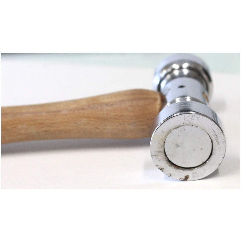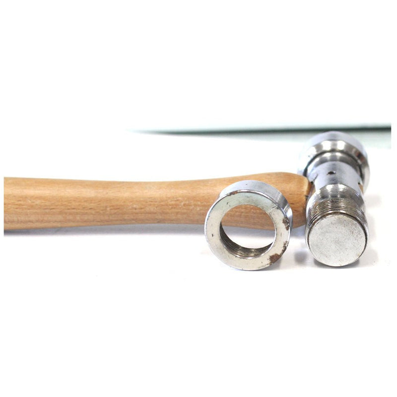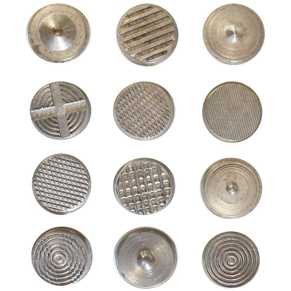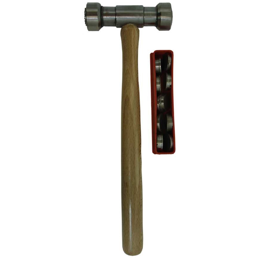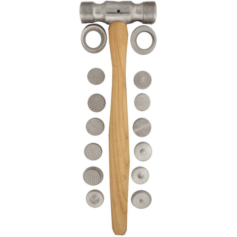 This Hammer Has A Variety Of Interchangeable Heads Which Will Leave A Variety Of Different Imprints When Used On Metal. The Heads Are Stored Neatly Away In The Box Which Is Included. The Hammer Has A Solid Wood, Sturdy Handle. Hammer, and weighs 1 lb.* Set Contains 1 hammer + 12 hammer faces in different shapes & patterns * This amazing hammer is 10 Inches long, and the head measures 3-1/2 inches * Each of the 12 interchangeable faces has a diameter of 5/8 inches * Each hammer face is securely attached with a threaded collar * It's like getting 12 tools in one! You're going to love what this hammer can do!