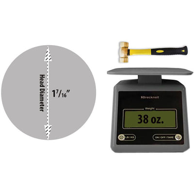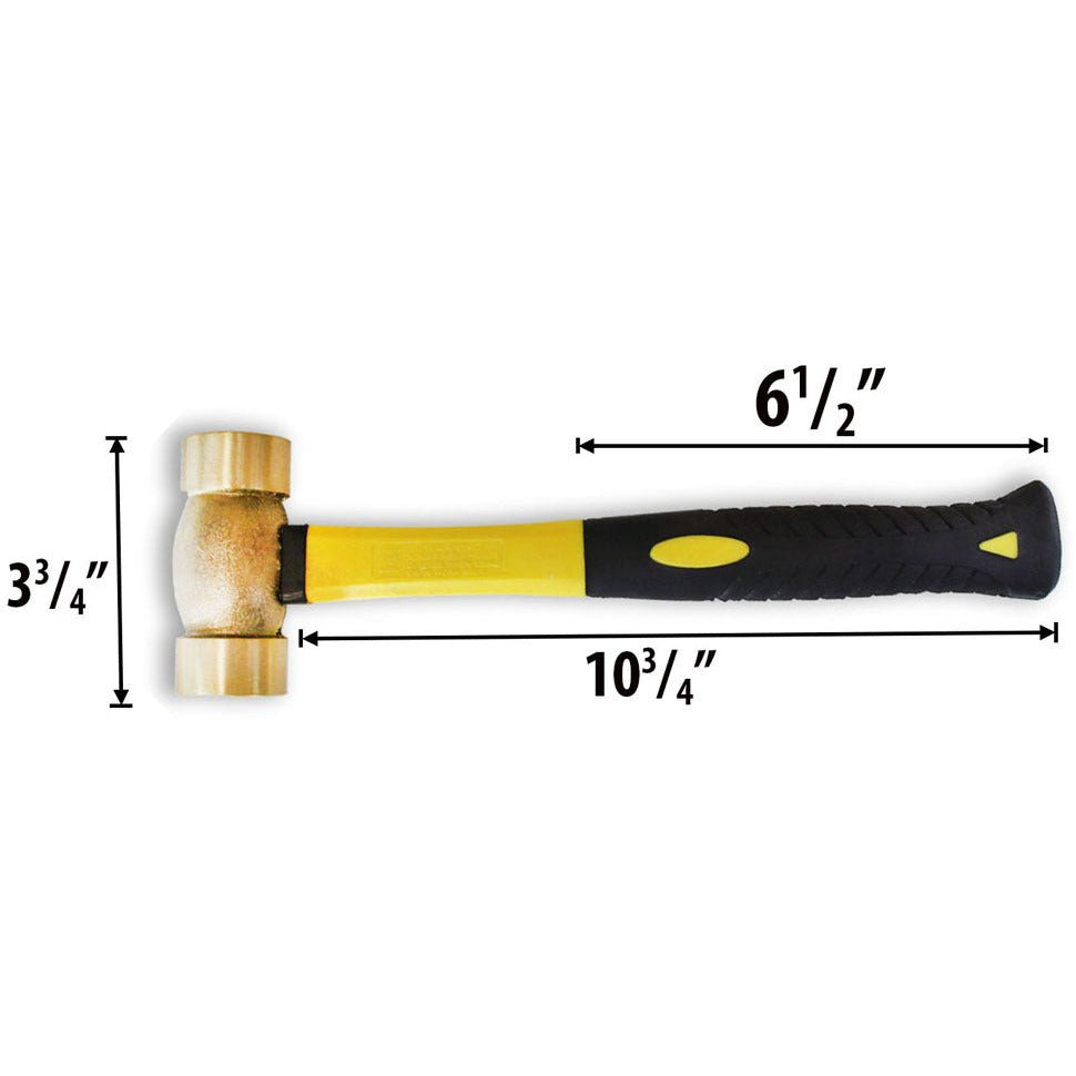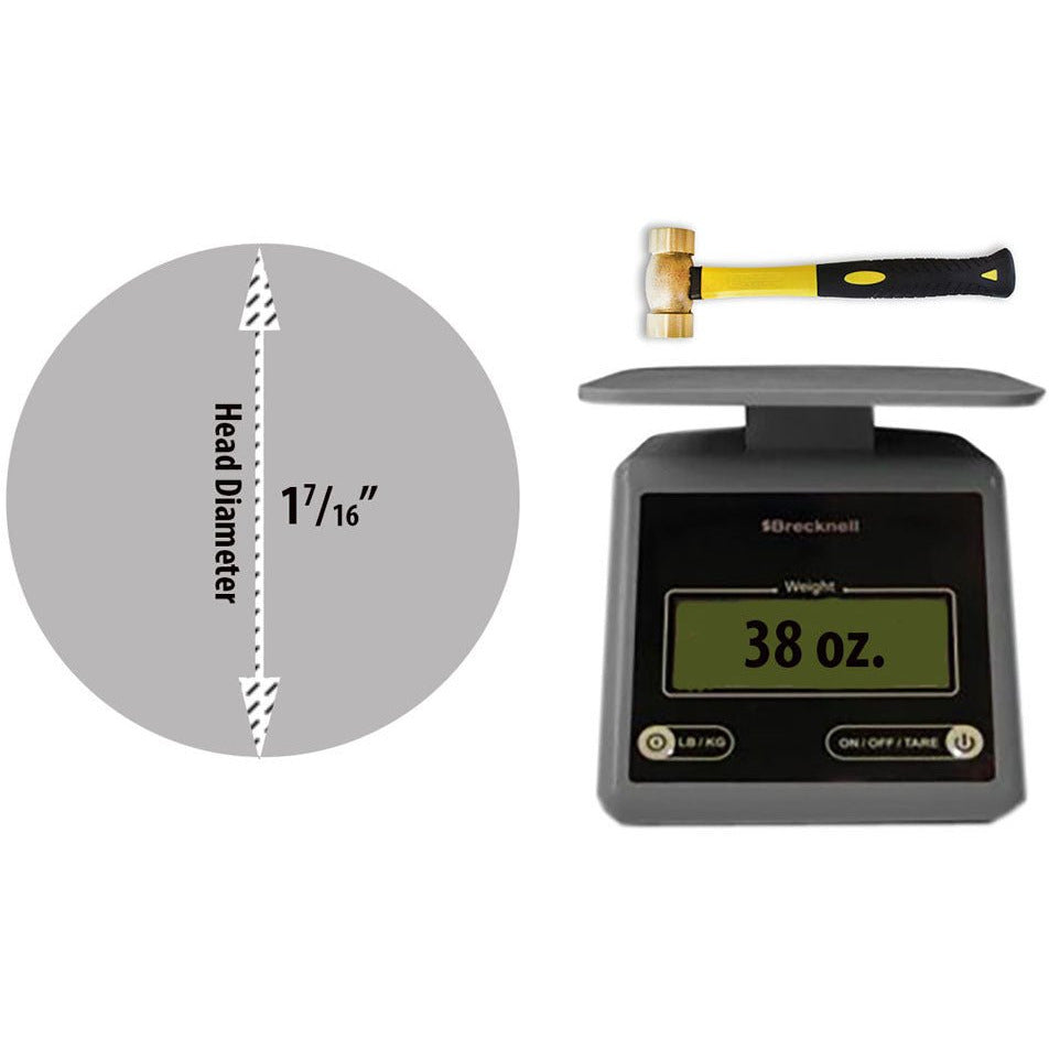 This hammer features a 32 ounce (2 lb.) brass double sided hammer headHammer head is 3-3/4" long and has a striking surface of 1-7/16 inches on each side; overall 12-5/16 inches tallThis hammer is equipped with a 6-1/2" heavy duty fiberglass handle with a rubber gripThis hammer is excellent for use with an anvil or bench block for flattening metal A great hammer for a jeweler - using number and letter punches to personalize