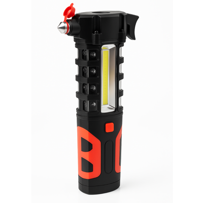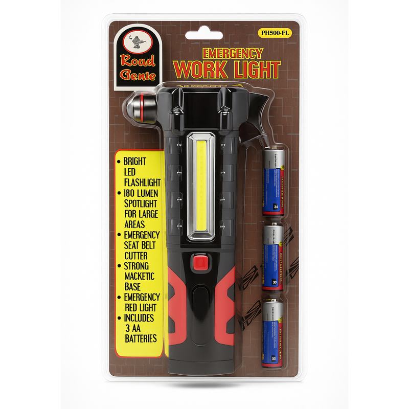 Be ready for any roadside emergency with this versatile Auto Emergency Work Light (Model PH580-FL). It combines multiple lifesaving tools into one compact design — a bright flashlight, powerful work light, red emergency flasher, window-breaking hammer, and seat belt cutter.