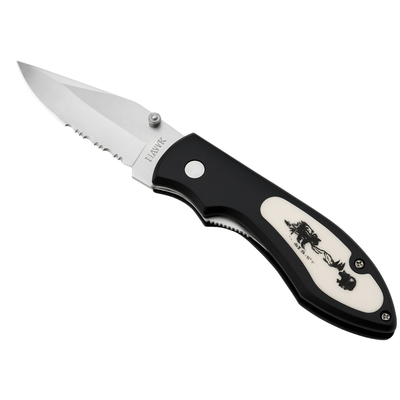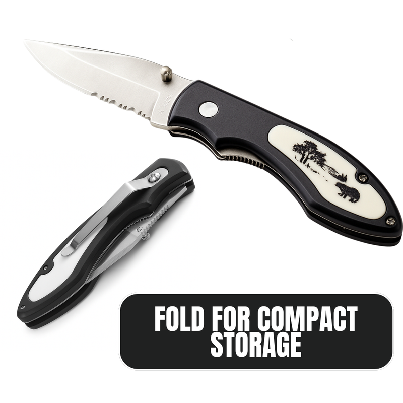 The 3-inch stainless steel blade delivers sharp, reliable cutting power, with a half smooth edge for precision and a half serrated edge for tougher materials. The handle features a striking ivory-and-black bear inlay, giving the knife a bold wilderness look while offering a comfortable grip.