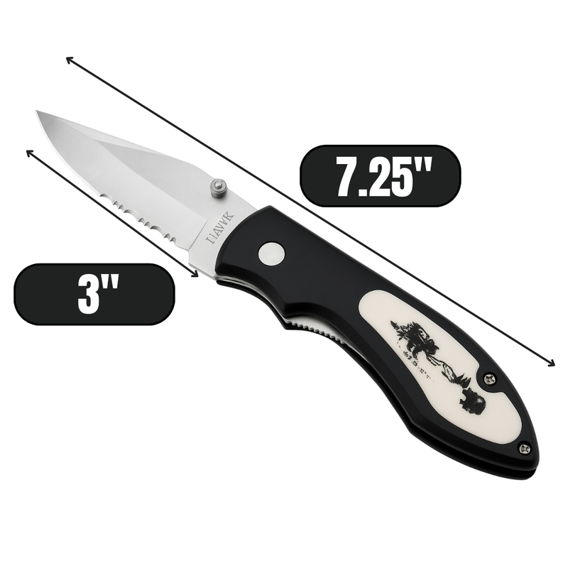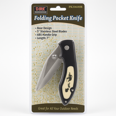 DIRK Hunting Pocket Knife – 3" Stainless Steel Blade (Half Smooth / Half Serrated) with Bear Design Handle – 7.25" Open Length, 3.3 oz – Metal Belt Clip – PK-20699