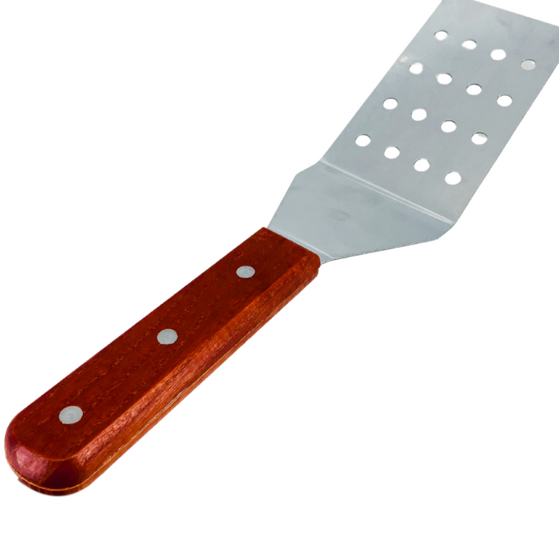 Elevate your grilling game with our professional stainless steel perforated griller turner spatula. Crafted with premium stainless steel and featuring precision-cut perforations, this spatula is designed for optimal grilling performance. The riveted smooth wooden handle provides a secure and comfortable grip, while adding a touch of elegance to your barbecue tools collection. Whether you're flipping delicate fish fillets, juicy burgers, or tender vegetables, this spatula is the ultimate tool for achieving restaurant-quality results on your grill.