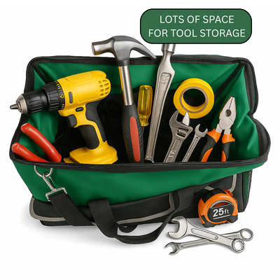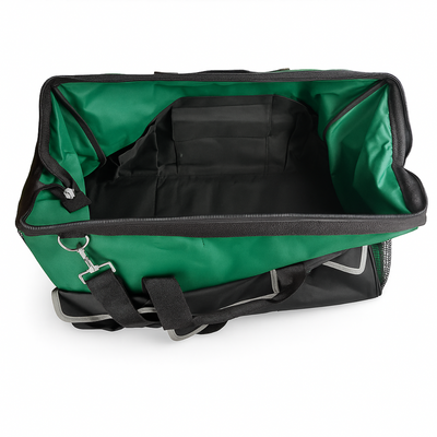 This heavy-duty tool bag is the perfect companion for professionals on the go. With its durable green and black construction, it's built to withstand the rigors of any job site. Multiple pockets and compartments provide ample storage space for all your essential tools and equipment, while reinforced straps and handles ensure a secure and comfortable carry. The mesh panel allows for ventilation, keeping your gear organized and easily accessible. Whether you're a contractor, electrician, or handyman, this versatile bag offers the functionality and convenience you need to tackle any project with ease. Designed with functionality in mind, this tool bag is a must-have for anyone who values quality and practicality.