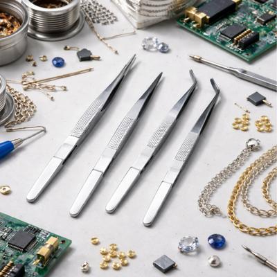 Includes four precision tweezers in different sizes and tip styles for gripping, holding, and positioning small objects. Perfect for crafts, jewelry work, electronics, hobby projects, laboratory work, and general precision tasks.