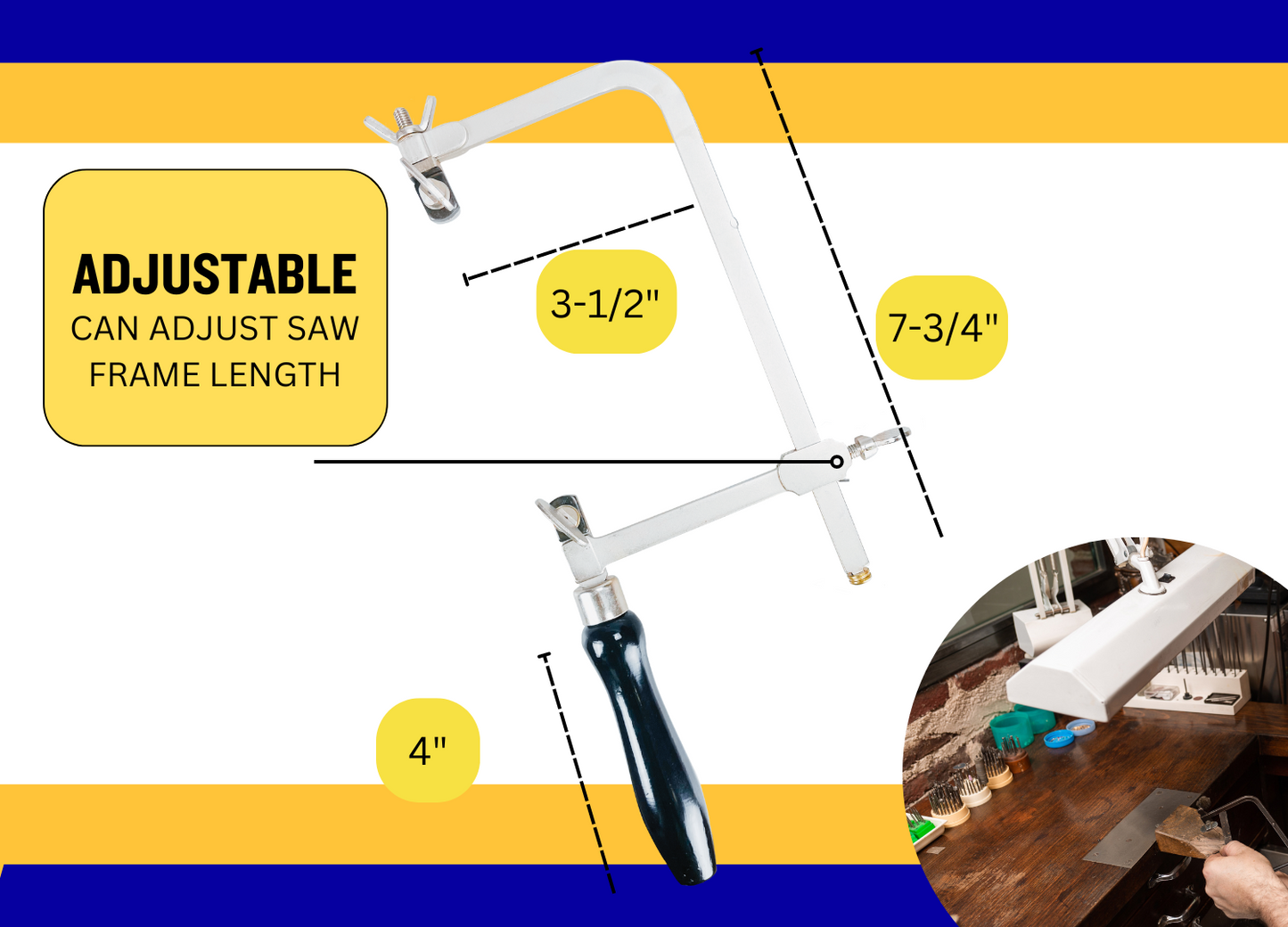 3-1/2 inch adjustable jeweler's saw frame - this frame can take a variety of saw blade sizes. The 3-1/2 inch deep throat for average length work projects. The throat size helps give you more freedom of movement as you work the saw.This jeweler's saw frame is a 3-1/2 inch size - that is the distance between blade holders & frame Blades (not included) are held in place by a combination of wing nuts and small metal plates Nickle plated satin smooth finish - this saw has a 3-1/2 inch throat to allow freedom of movement This saw frame will take a variety of saw lengths and sizes up to 7 inches The 4 inch wooden handle is smooth and ergonomically shaped to hold comfortably