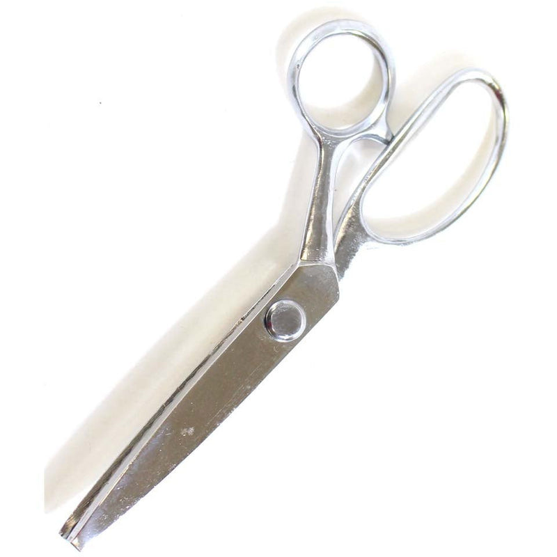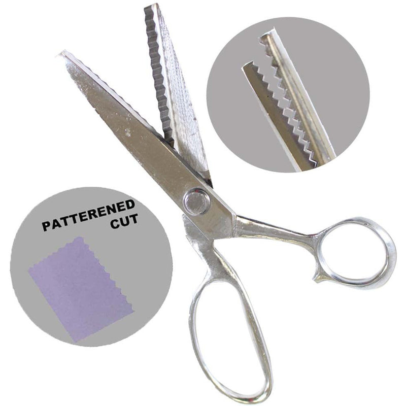 These are the classic tailor's pinking shears, with the standard zig-zag pattern. Perfect for both professional and personal use. Fully polished, heavy duty cast steel. They are 8 inches long overall, with a traditional handle.* 8 inches overall with 4 inch blades, 5 teeth per inch - total weight of 8.2 ounces * These shears are fully polished and chrome plated with large hand grip * These shears have the classic zig zag wave pattern for sewing and crafting * Trimming fabric edges with pinking shears will help prevent fraying of the fabric * Used by professional tailors, and do it yourselfers alike for projects at home