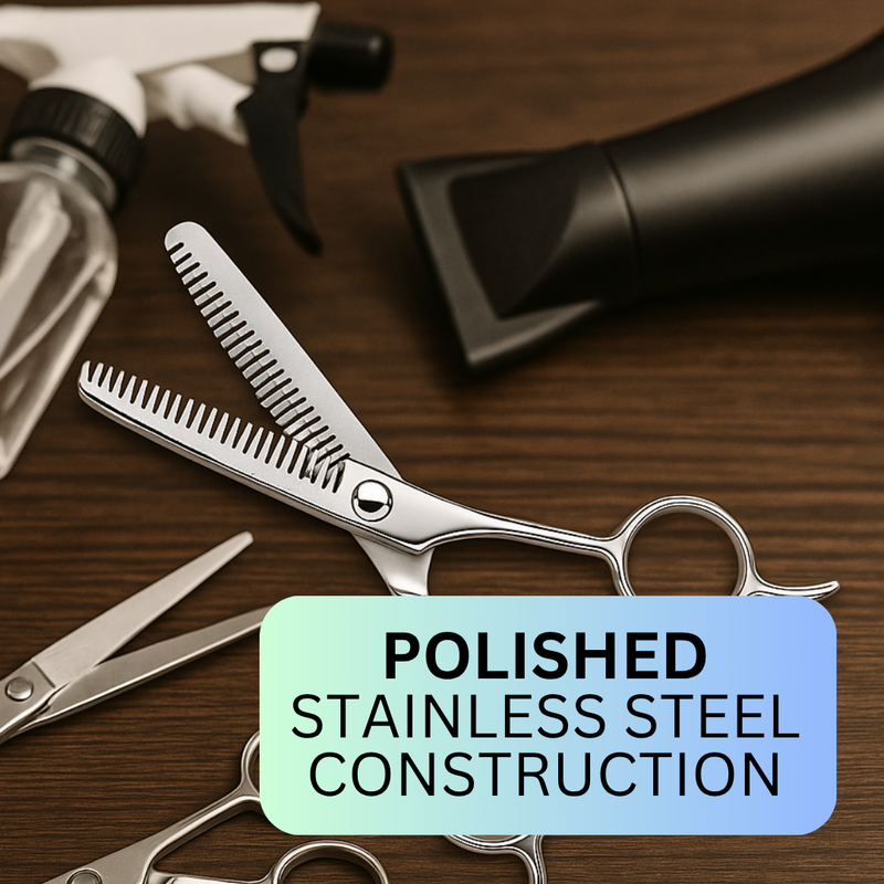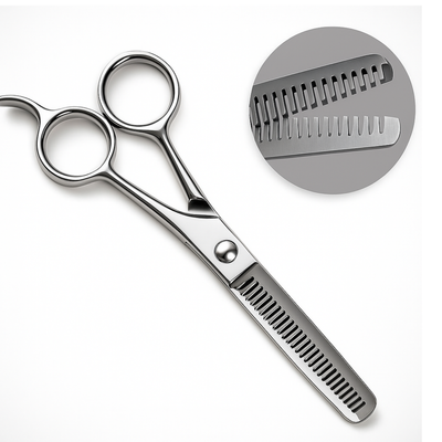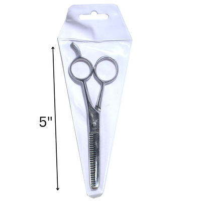 Theses scissors are just the perfect size for those hard to reach areas, around the ears and the sideburns. This double edged scissors thins hair beautifully. Both sides have "comb-like" thinning blades. The blade portion is about 2" long from the pivot point. Overall the scissors are 5" long - excellent for bushy eyebrows, sideburns, mustaches and beards.* 5 inches long, with 2 inch blades below the pivot point - about 12 "teeth" per inch * Stainless steel with blunt tips for safety - excellent for home hair-cuts or travel * Finger control lever just like a regular barber scissors, but both sides have comb type blades * Thins bushy hair on the head and face - mustache, beard, eyebrows, sideburns * Super sharp blades will leave you neatly trimmed - for barber shop professionals or home use