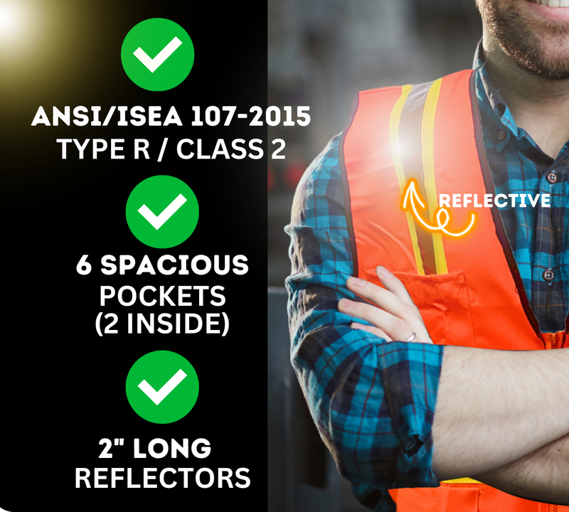 This Orange Safety Vest Is Made Of 100% Polyester Fabric, With A Zipper Front. This Vest Features Multiple Pockets And 2 Inch Wide Silver And Neon Green Reflective Stripes, Front And Back. This Vest Will Provide High Visibility For Workers, Both Day And Night.* 2 Large front bottom pockets, and 2 upper multi-pockets provide for pens or small tools * 100% Polyester fabric in ultra bright highly visible neon orange color size medium (64 x 58cm) * Reflective stripes all around the mid section and over both shoulders & down the back * Stripes are a 2 inch combination of neon green fabric and silver reflector stripe * Oversized arm openings allowing room to be worn over regular clothing